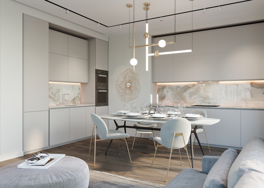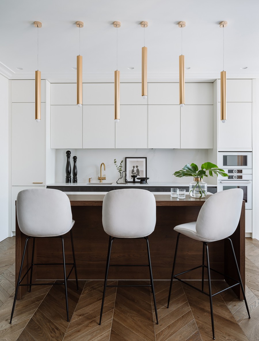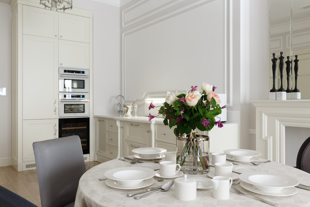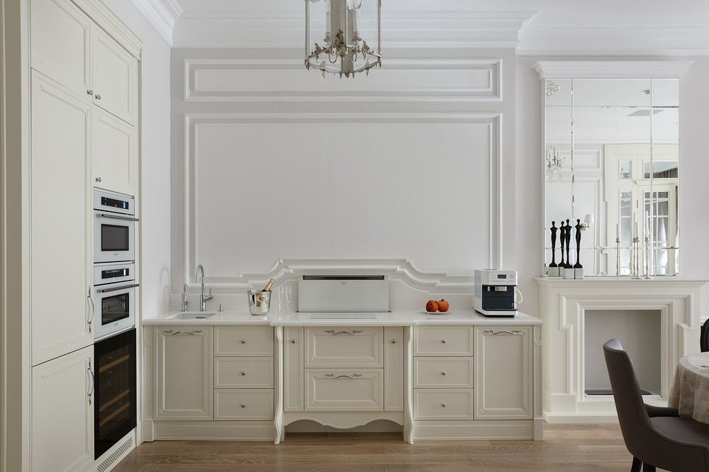 Кухня из проекта квартиры "Граф Орлов" выполнена в белом, ближе к светло-бежевому цвету. Чтобы интерьер смотрелся более современно, мы добавили декор из латуни и сделали фартук под мрамор.
