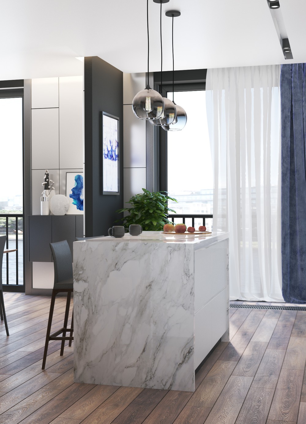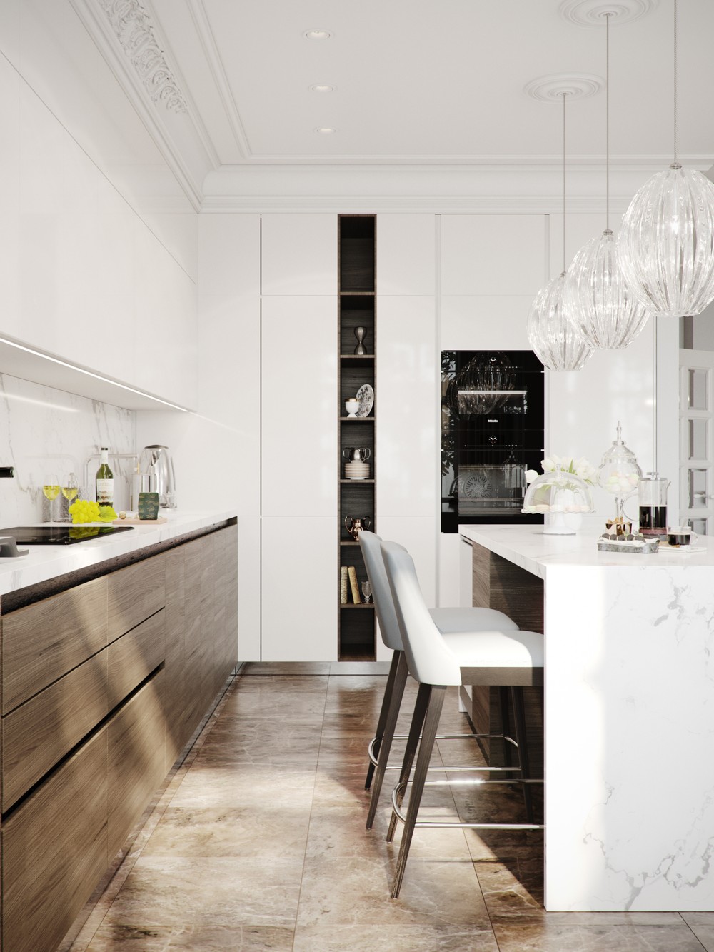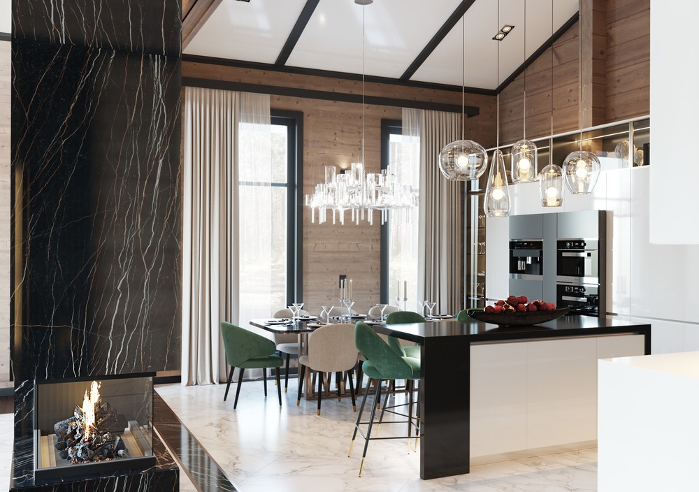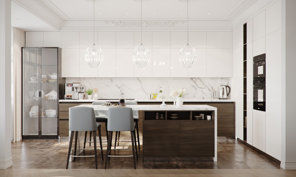 Белый цвет фасадов гармонично контрастирует с черной мраморной столешницей, барными стульями изумрудного оттенка и серым керамогранитом на полу.