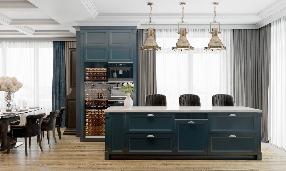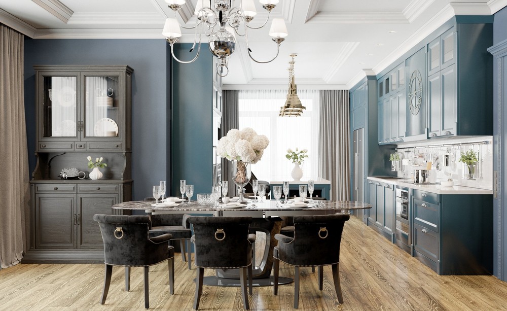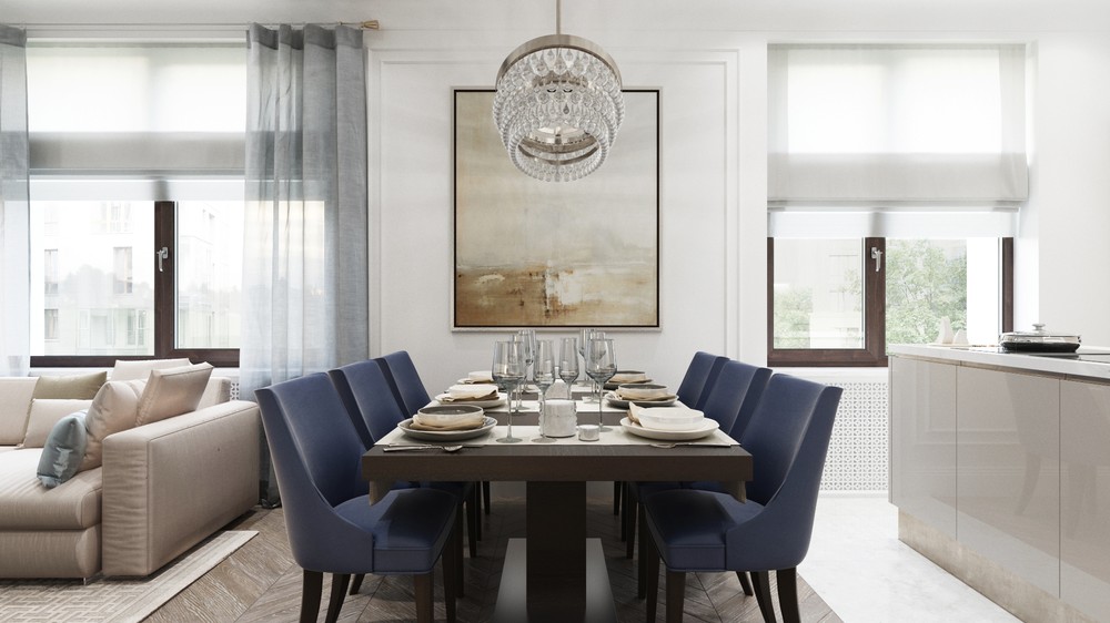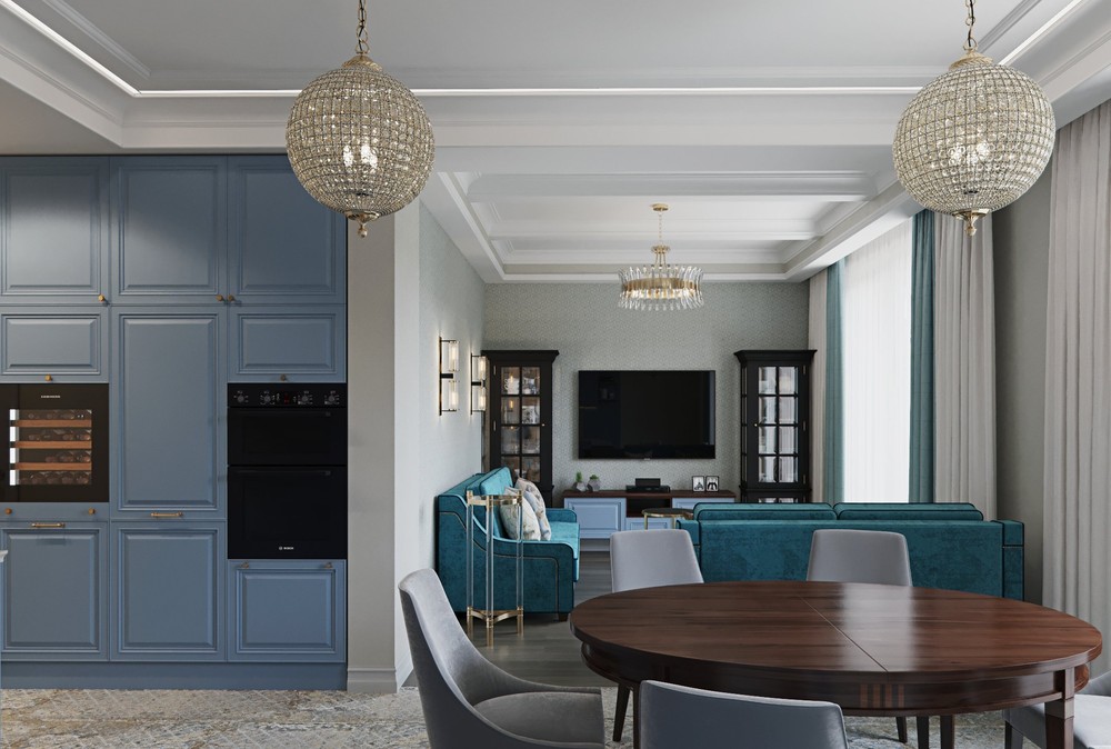 Традиционным цветом для классических интерьером считается бежевый оттенок, но в своих работах мы нередко используем альтернативные цвета, например, синий. Например, в проекте квартиры в «Brilliant House» мы использовали светло-серые и синие оттенки, которые уравновешивает интерьер кухни и гостиной.