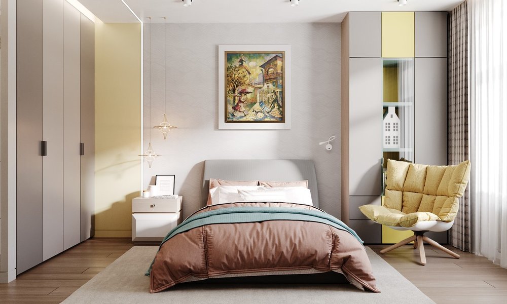 Серый — идеальная база для любой комнаты: от спальни и гостиной до ванной и гардеробной. А жёлтый способен разбавить скучноватую ахроматичную основу. Цвета можно использовать вместе или по отдельности.