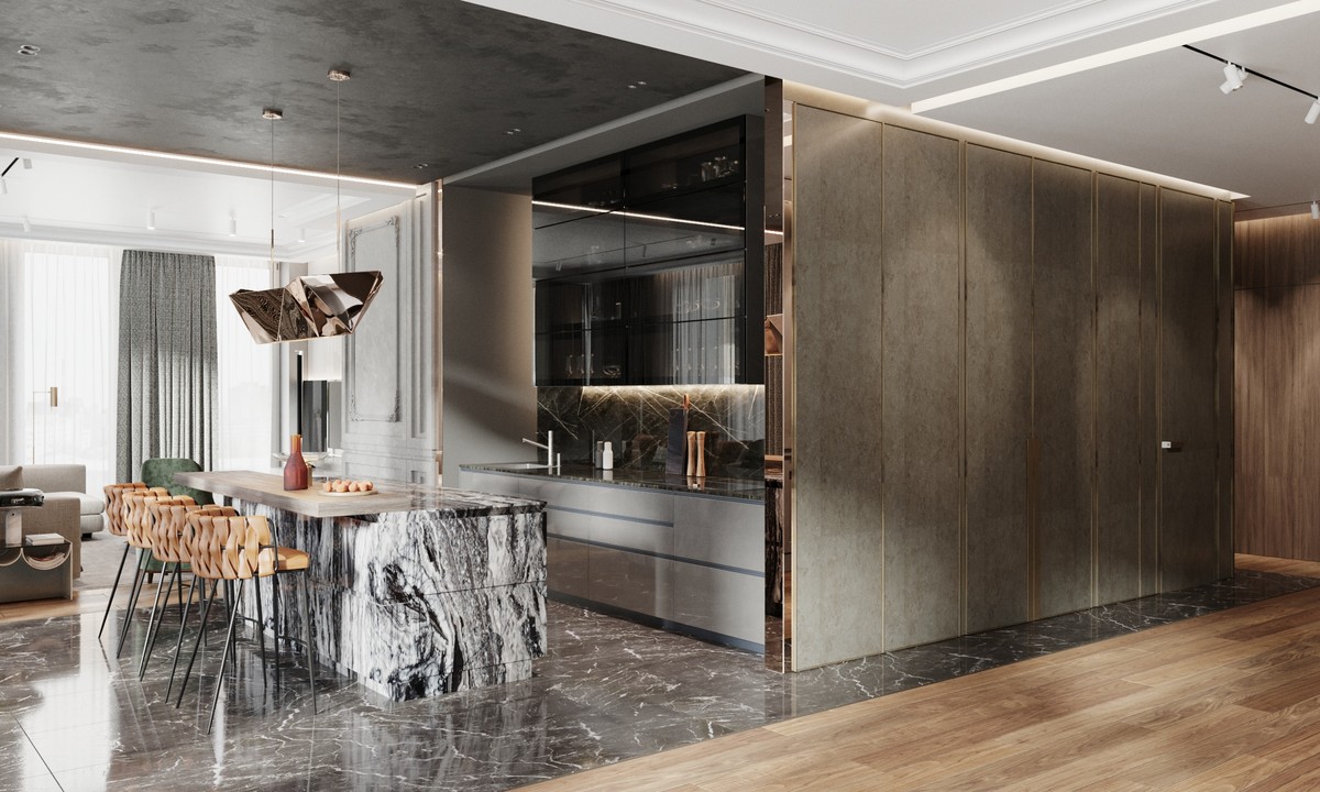 Проект квартиры выполнен в современном стиле с элементами эклектики и классики. Особенностью квартиры стали узкие панорамные окна и большая гостиная, которая состоит из самой гостиной, обеденной и барной зоны.