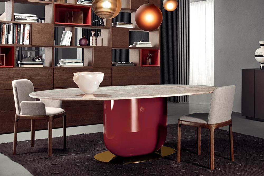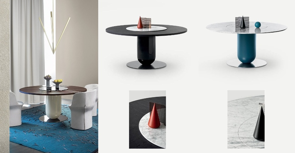 Модель состоит из простых геометрических элементов — в духе скульптурных объектов группы Mamphis, созданной Соттсассом. Тонкий диск столешницы опирается на монументальное каменное основание, которое сужается к низу и словно балансирует на небольшой металлической подставке. Отражение, которое возникает на блестящей поверхности металла, лишь усиливает этот эффект.