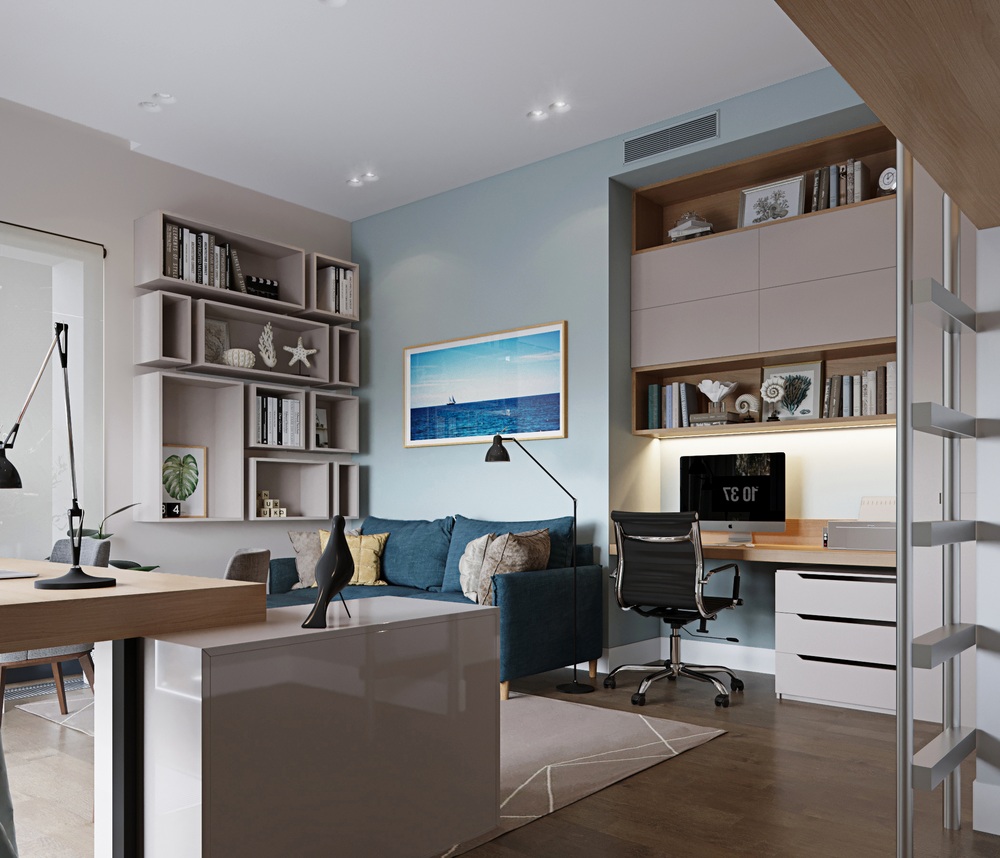 В данном проекте также организовано много систем для хранения. Кроме привычных стеллажей и шкафов в комнате, мы сделали рабочее место и большой открытый стеллаж на лоджии.