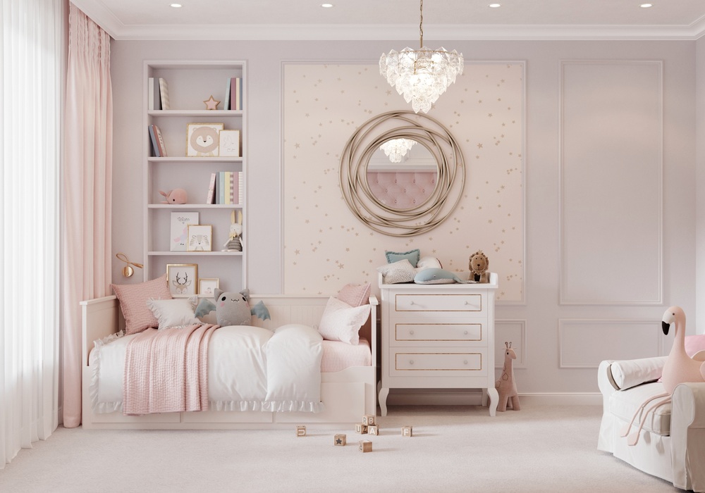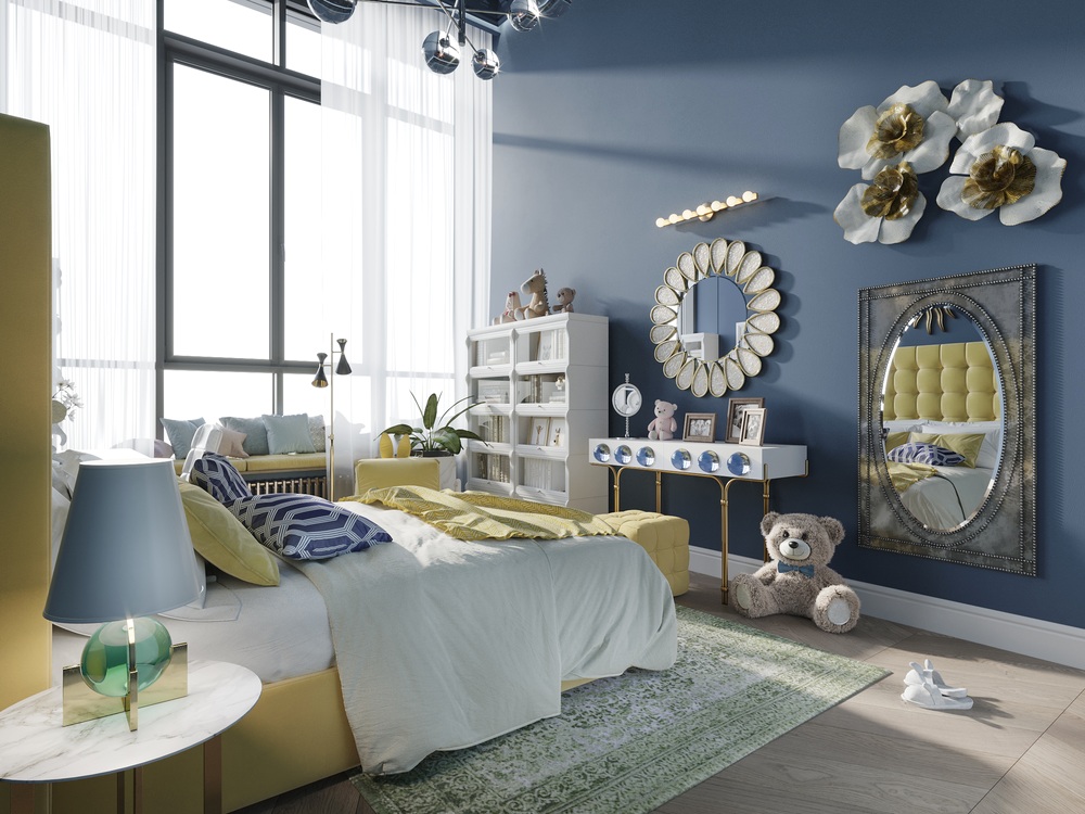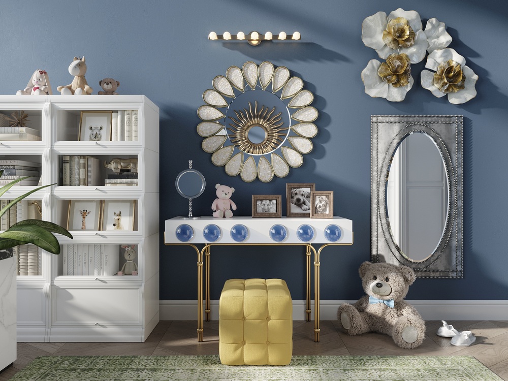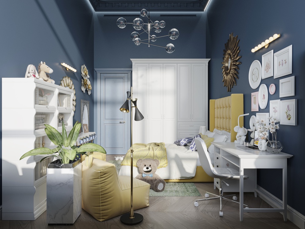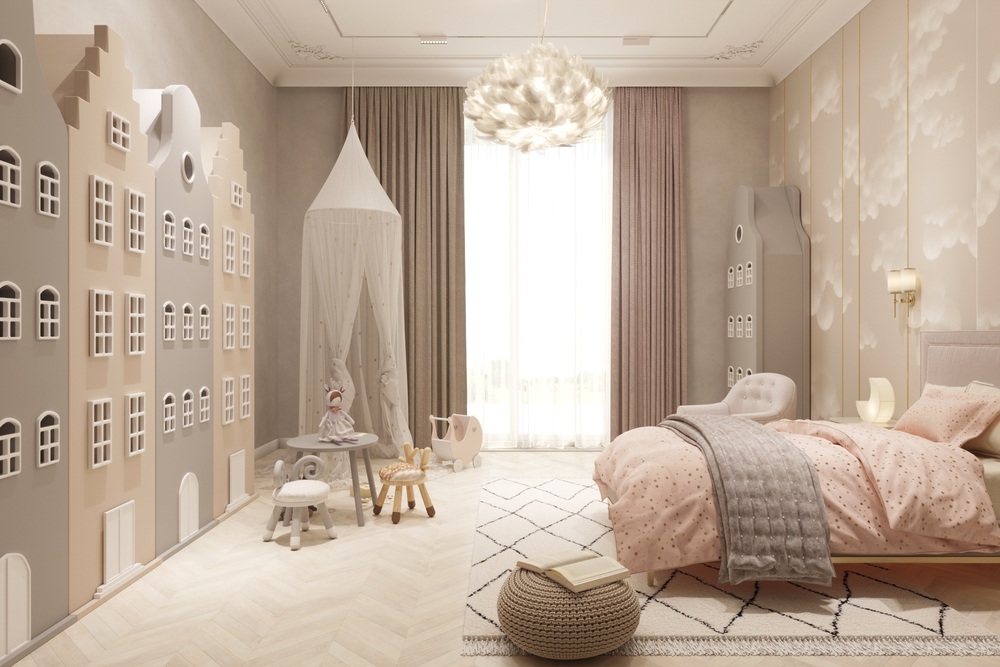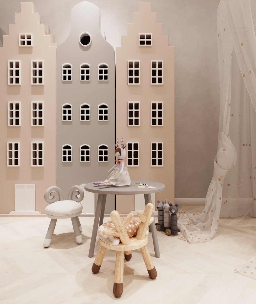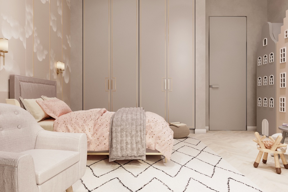 В проекте квартиры в ЖК "Привилегия" мы поставили "амстердамские домики", которые по большей части предназначены для хранения игрушек, альбомов и карандашей. Для хранения одежды предусмотрен большой встроенный шкаф с латунным обрамлением.