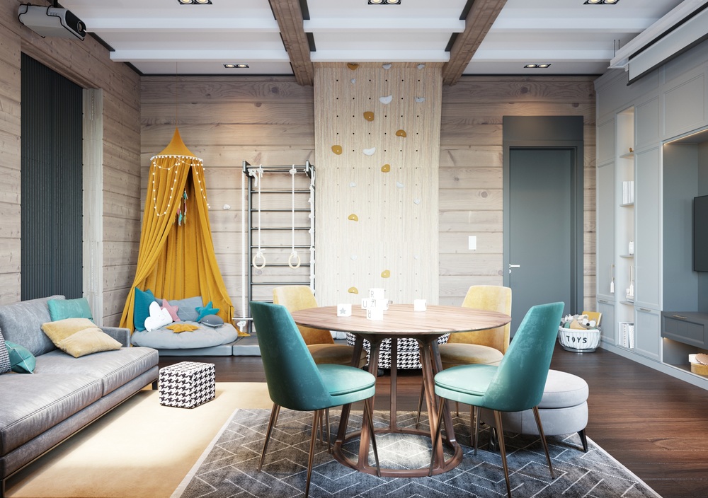- в "детском" уголке разместился игровая зона со шведской стенкой, стеной для скалолазания и сказочным шатром, в котором можно играть бесконечно;