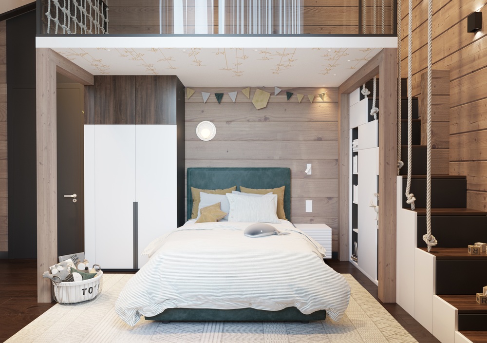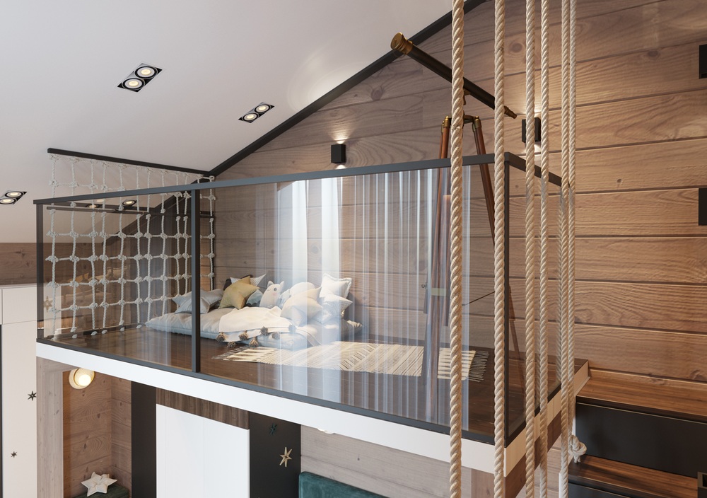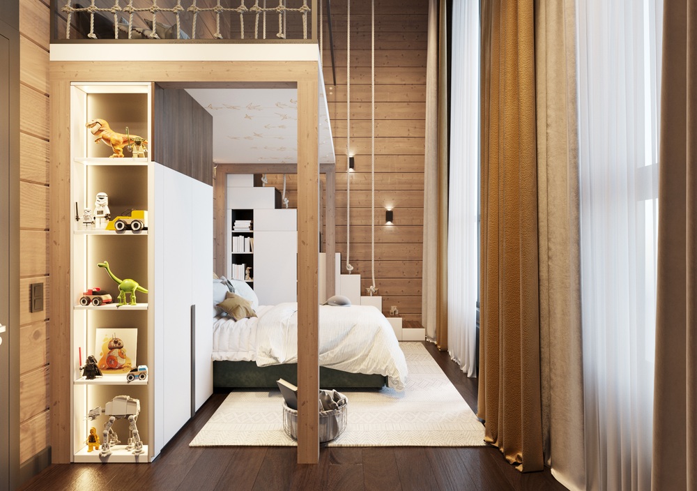 Высокие потолки второго этажа загородного дома позволили соорудить игровой домик, включащий спальное место, несколько шкафов и стеллажей, а также игровую площадку на втором уровне.
