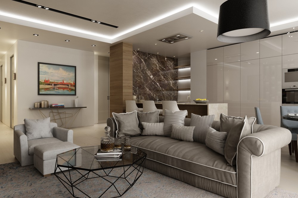 Квартира в современном стиле отличается рациональной организацией пространства и интересными дизайнерскими решениями. Гостиная, холл, кухня как бы перетекают друг в друга, образуя цельный и органичный художественный образ. Спокойная бежево-коричневая палитра и лаконичная обстановка не делают интерьер безликим, напротив, благодаря находкам дизайнера, он выглядит свежо и нестандартно.
