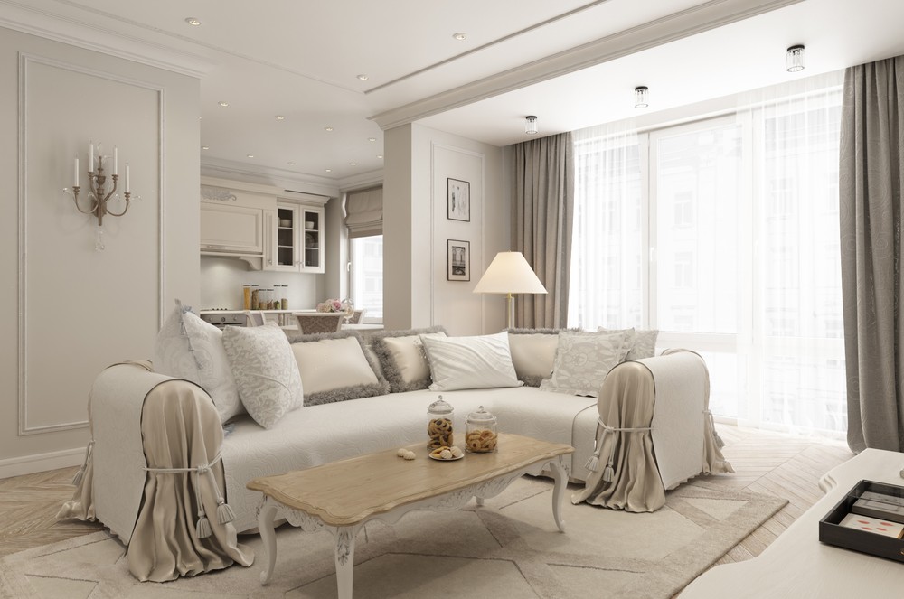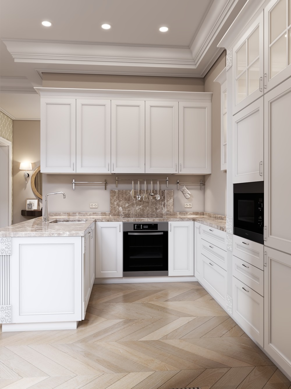 Столовая и кухня — часть общего пространства квартиры. С любой точки они смотрятся стилистически логично. Чтобы добиться этого эффекта, мы выбрали белую кухонную мебель с классическими фасадами, которая выглядит уместно в соседстве с диваном и креслом традиционной формы.