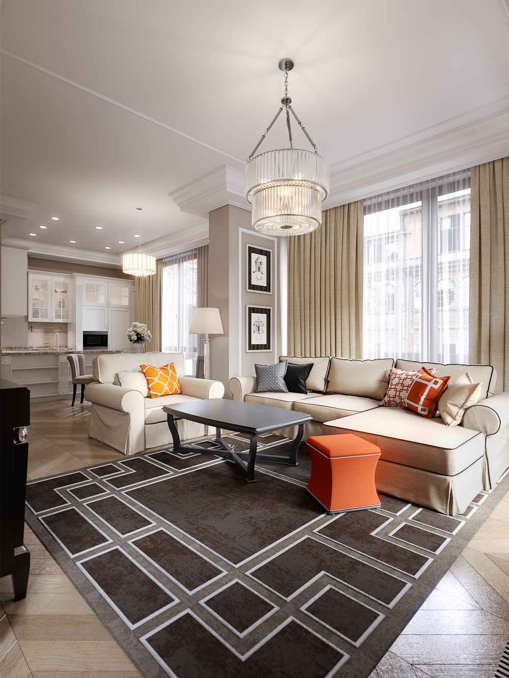 Светлая мебель и текстиль работают на создание легкого и вдохновляющего интерьера. Чтобы комната не выглядела блёклой, мы внесли несколько контрастных штрихов: яркие апельсиновые подушки и пуф, а также ковер цвета кофейных зерен с крупным рисунком.