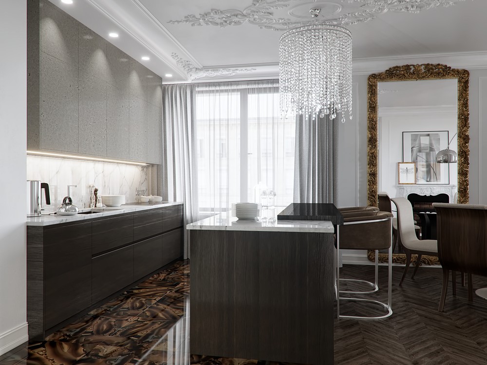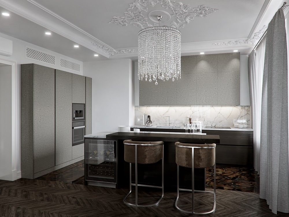 На кухне готовят редко, поэтому вместо фартука поставили бортик, повторяющий форму молдингов на стене. Он предохраняет от брызг и жира. Чтобы кухня сливалась с остальным интерьером, варочная поверхность выполнена из белого стекла.