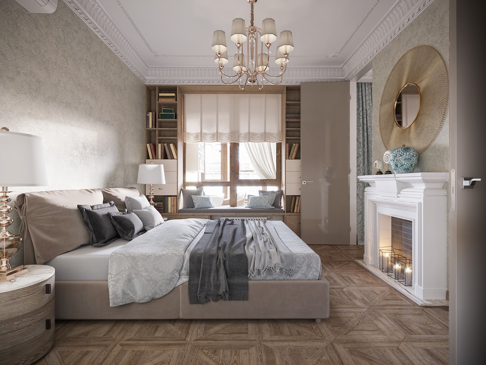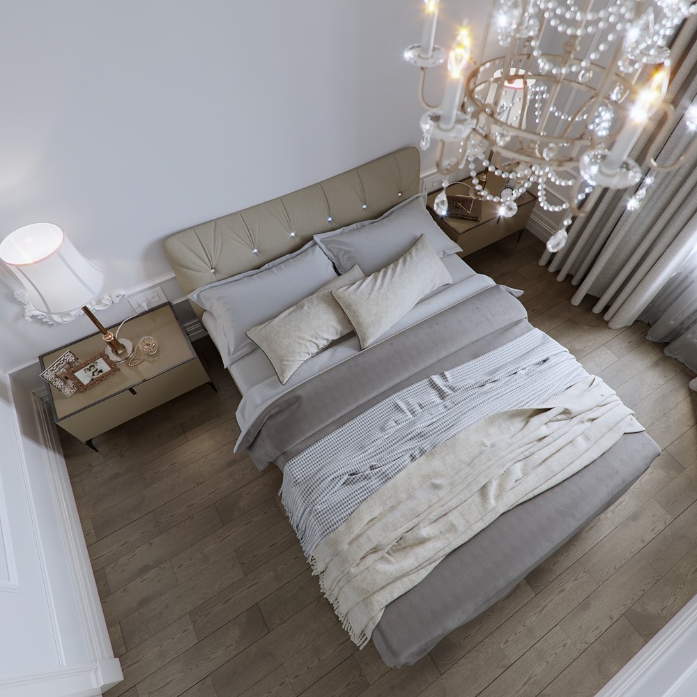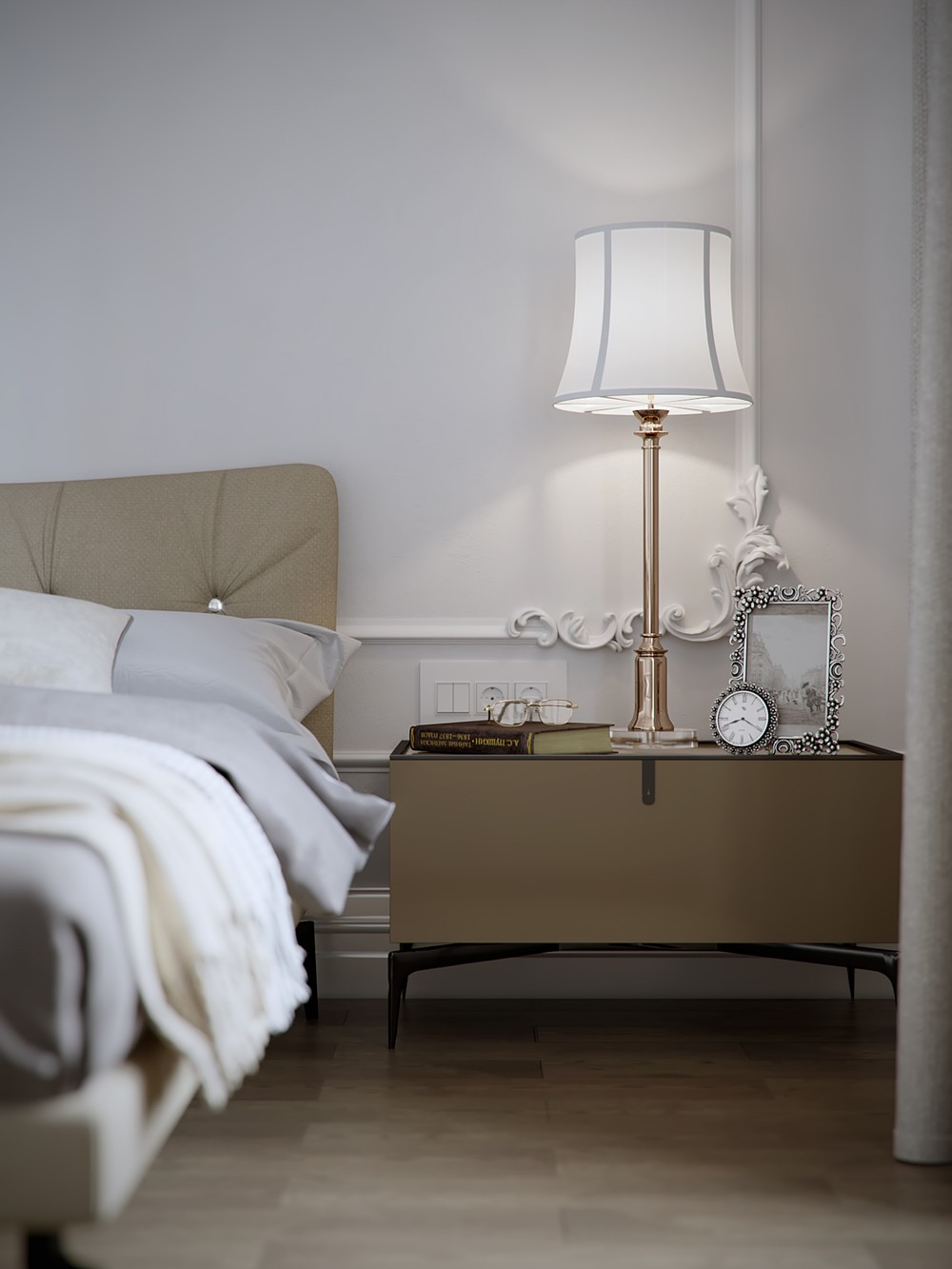 Классическая лепнина — это первое, что замечаешь, попадая в спальню. В пару к ней мы добавили элементы современного дизайна в мебели и аксессуарах - вместе они создают интересное настроение.