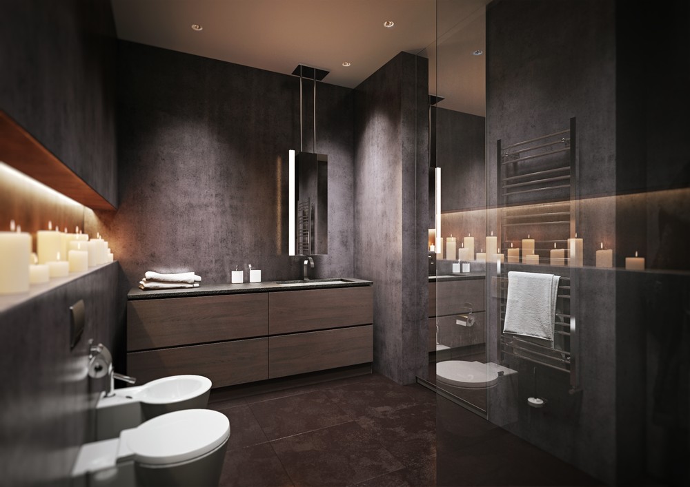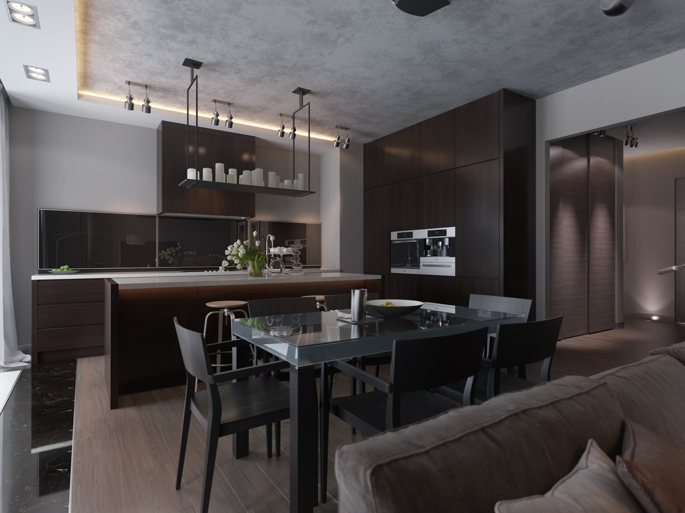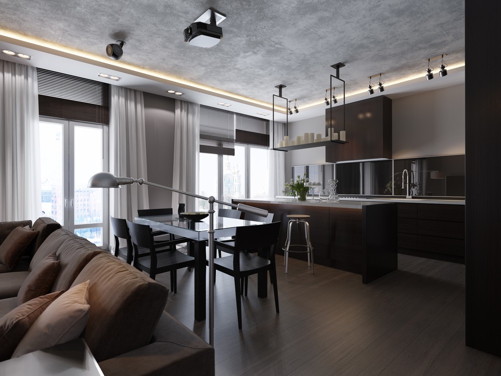 Сдержанный, практичный, холодноватый, отчасти брутальный интерьер выполнен в современном функциональном стиле, для которого характерны отсутствие лишних деталей, продуманность и завершенность. Этот авторский дизайн призван показать самостоятельность и состоятельность хозяина, подчеркнуть его смелость и статус.
