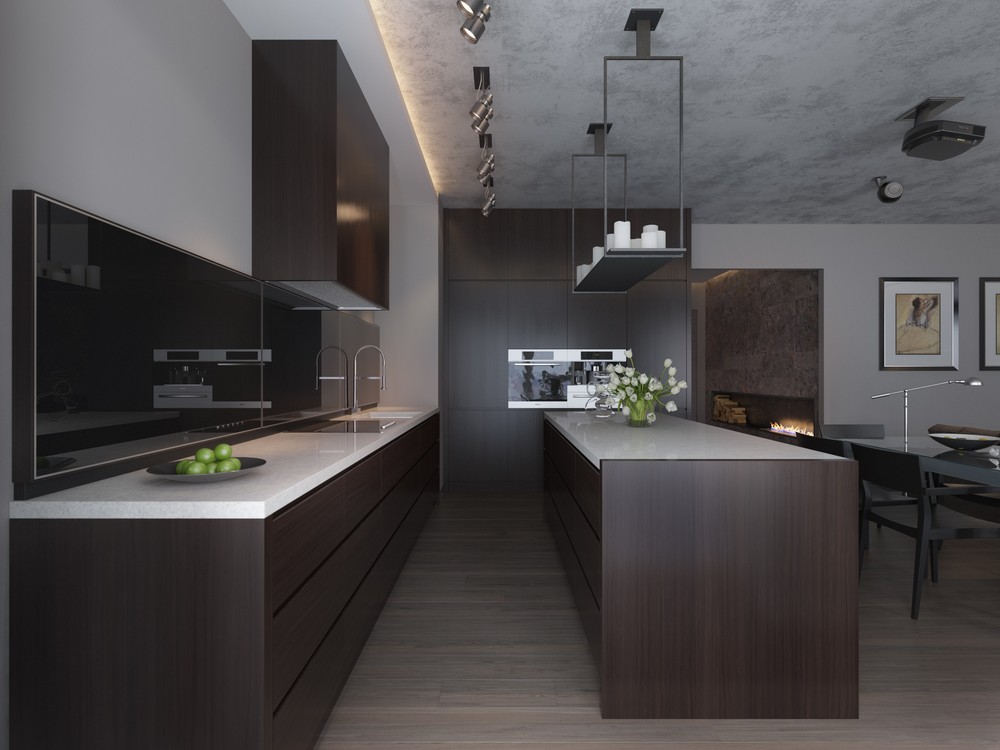 Кухня поддерживает основную идею интерьера, но не пытается завладеть вниманием. Цвета сдержанные; формы и поверхности — лаконичные, без шумных поверхностей и лишних текстур.