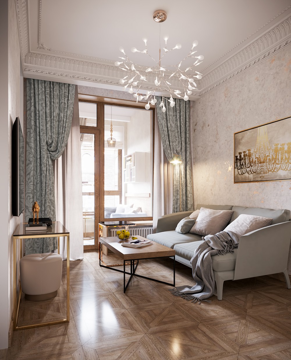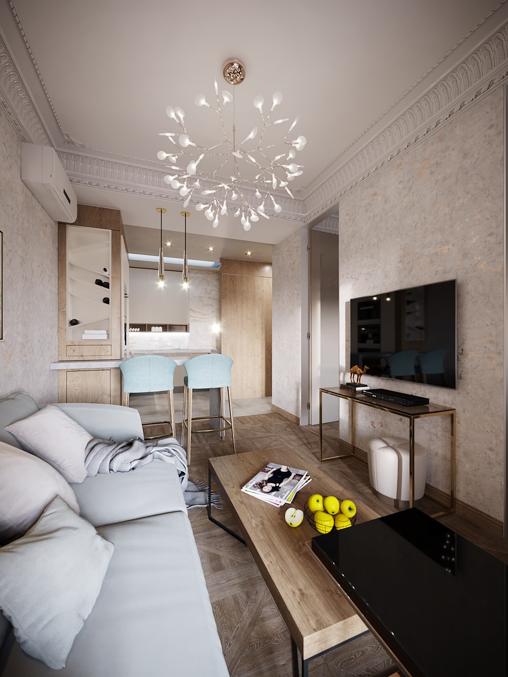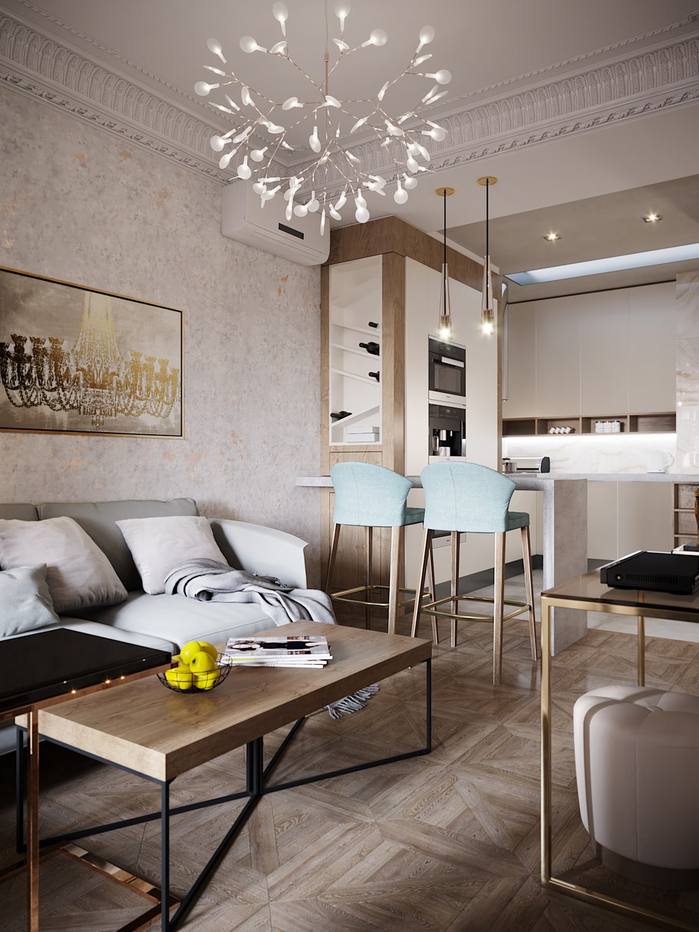 Мы пошли на эксперимент и соединили классический стиль в отделке с мебелью современного дизайна. Контраст дал поразительный эффект: будто впустил порывы свежего воздуха, и традиционная классика зазвучала по-новому. Оставалось решить проблемы невысокого потолка и небольших помещений, чтобы создать интерьер, которым хочется поделиться.