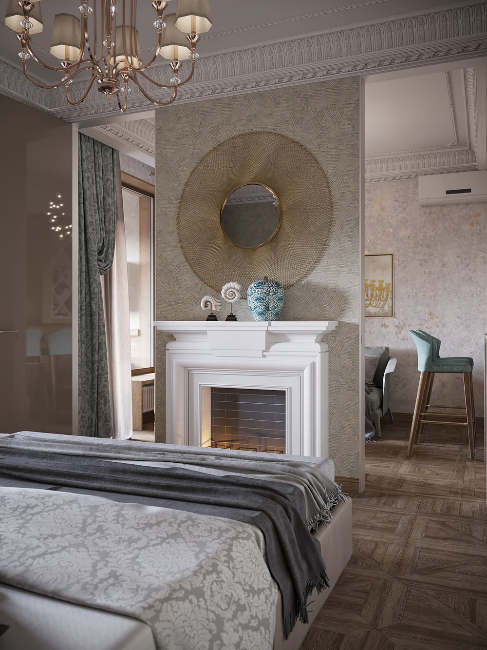По задумке дизайнера, спальня и гостиная должны выглядеть как единое, цельное пространство. Для решения этой задачки мы сделали два узких проема во всю высоту и использовали в спальне те же лепные элементы, что и в гостиной. Результат налицо.