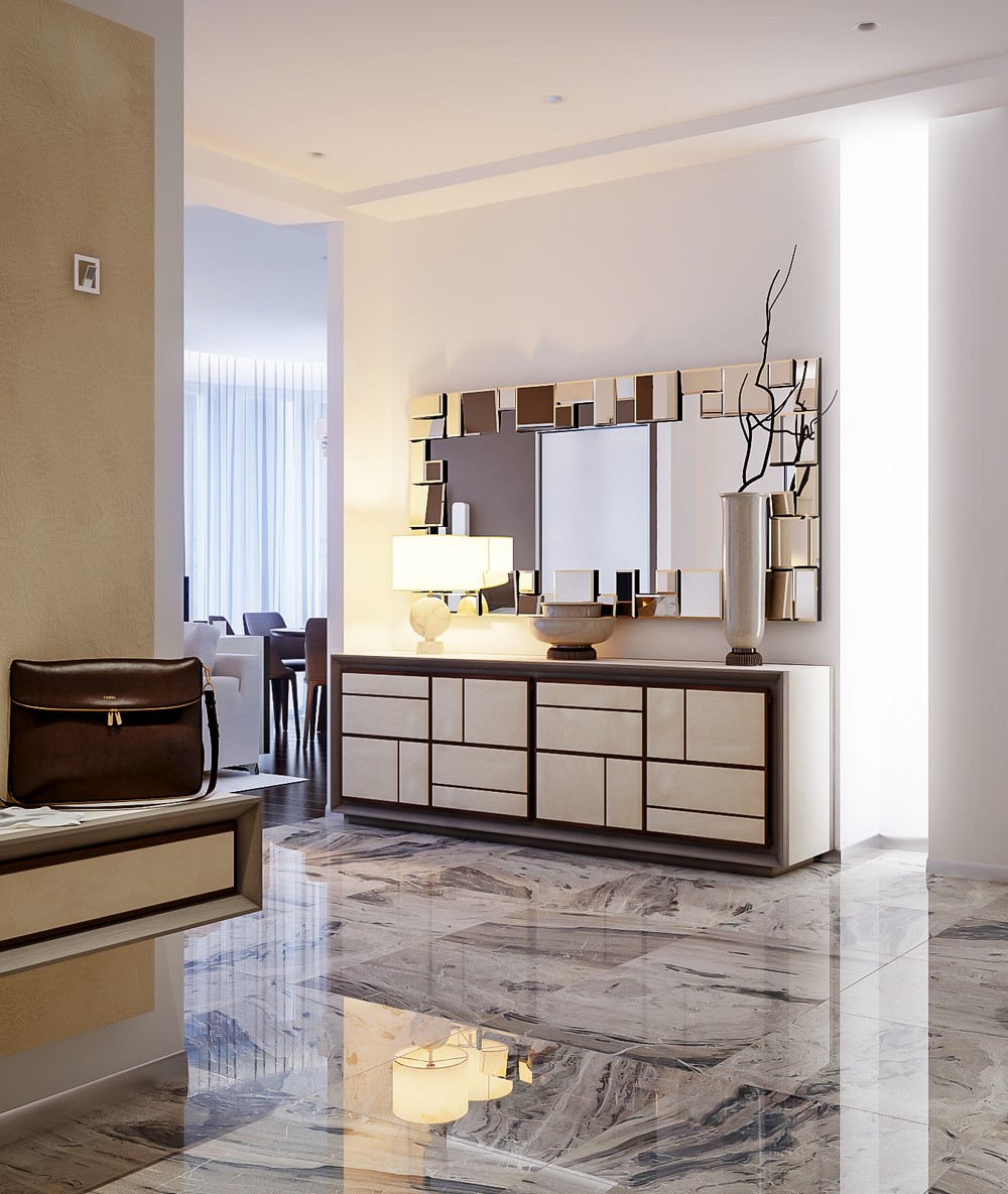 Отдельного внимания заслуживает прихожая, которая хорошо просматривается из гостиной и поэтому максимально чиста и опрятна. Одежда и обувь сразу убираются в скрытый платяной шкаф. На полу — практичная и красивая плитка под мрамор.