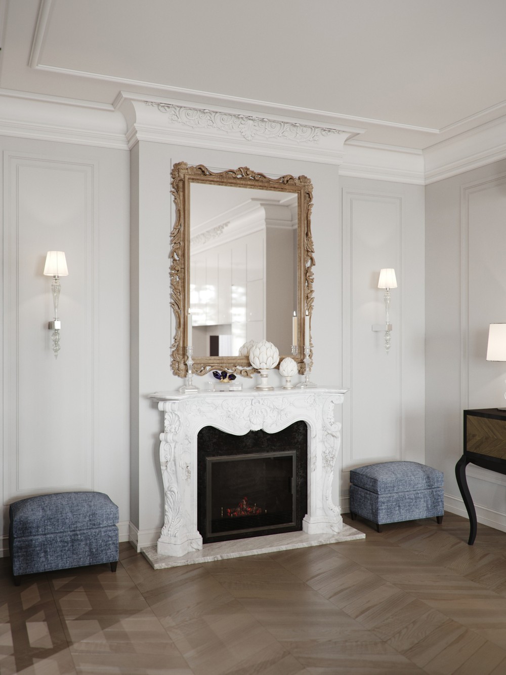 Золото в раме, пасмурно-синие пуфы и паркет из натурального дерева добавляют интерьеру тепла и изысканности.