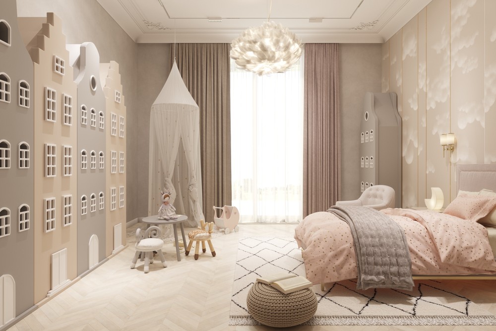 Не менее интересны и сложны по исполнению интерьеры спальни и детской комнаты.