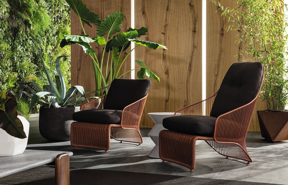 Кстати, обратите внимание на прошлогоднюю новинку от Minotti - современные и слегка минималистичные кресла Colette с металлическим каркасом и мягкой спинкой, которые идеально впишутся на только на террасе загородного дома, но даже в гостиной.