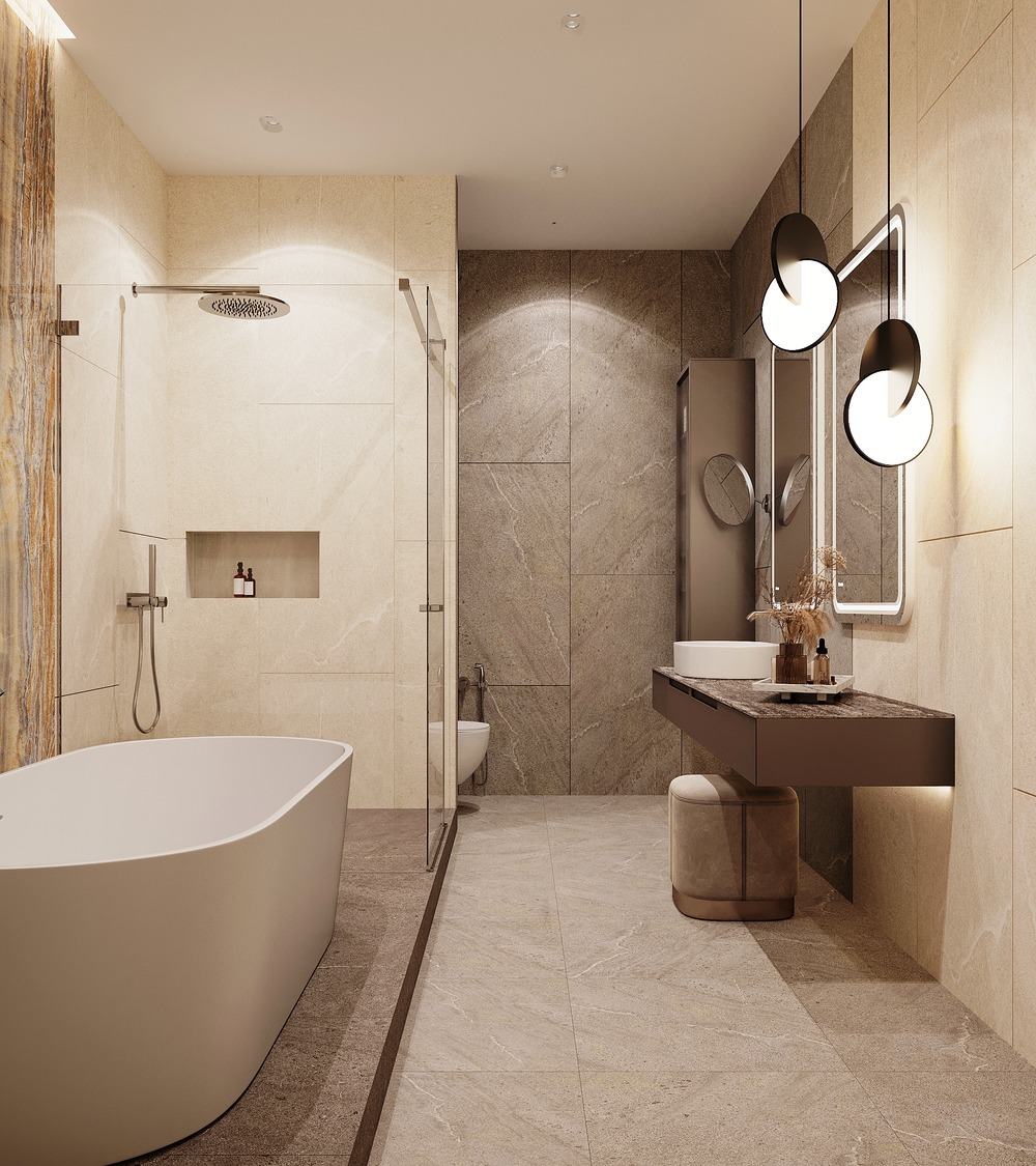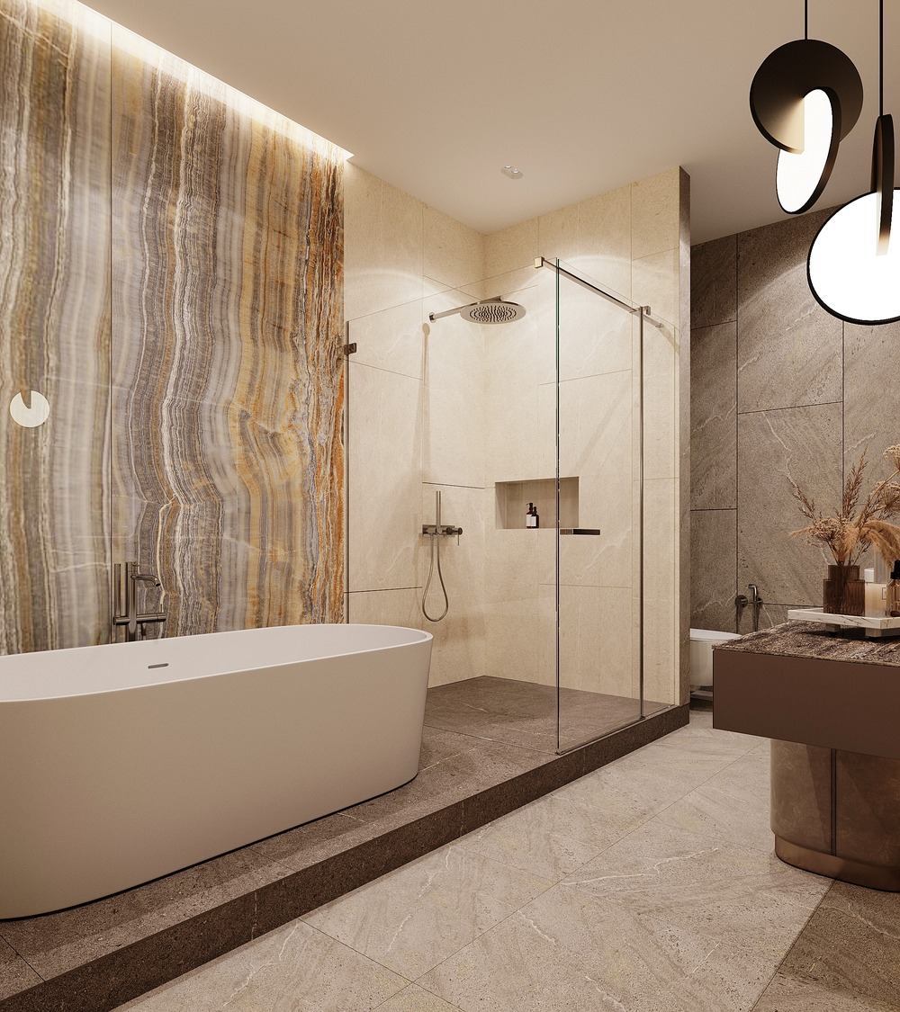 Для проекта этой квартиры мы разработали два варианта ванной комнаты, которые отличаются лишь цветовой гаммой, все остальное - неизменно. Это и удобная планировка, и крупноформатные слэбы в отделке, и стильная отдельно стоящая ванна, которая делает интерьер шикарнее и придает комнате современный вид.