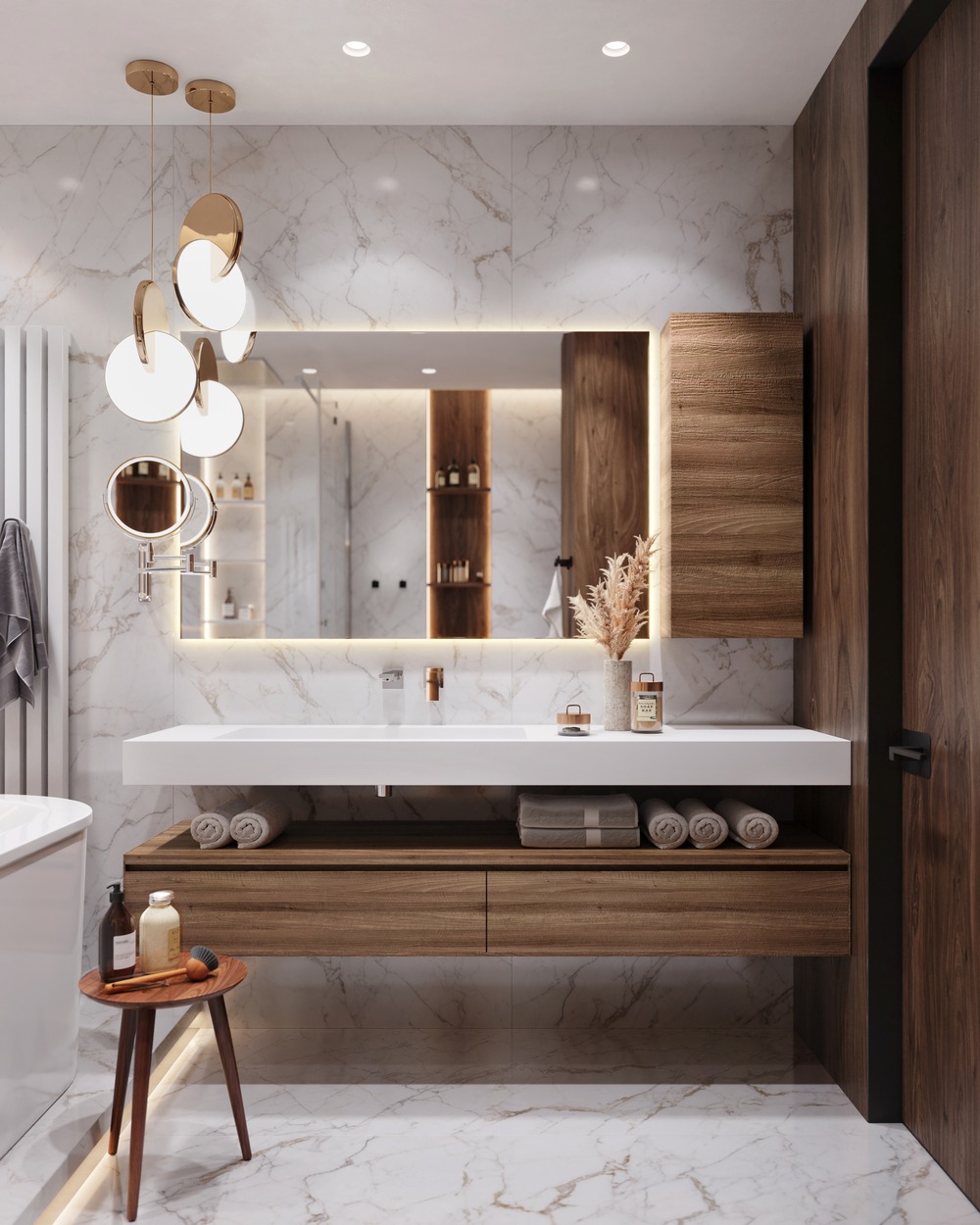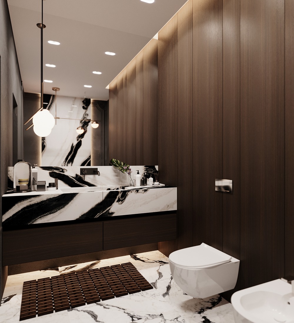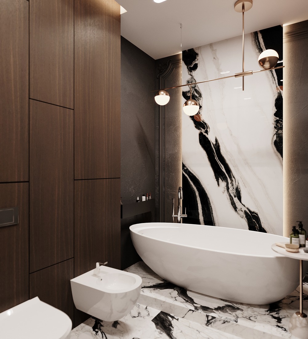 В отделке ванной комнаты используется крупноформатный керамогранит под мрамор. Чтобы комната не выглядела чересчур холодной, были добавлены деревянные элементы, а также небольшие золотые акценты, которые идеально вписались в интерьер.