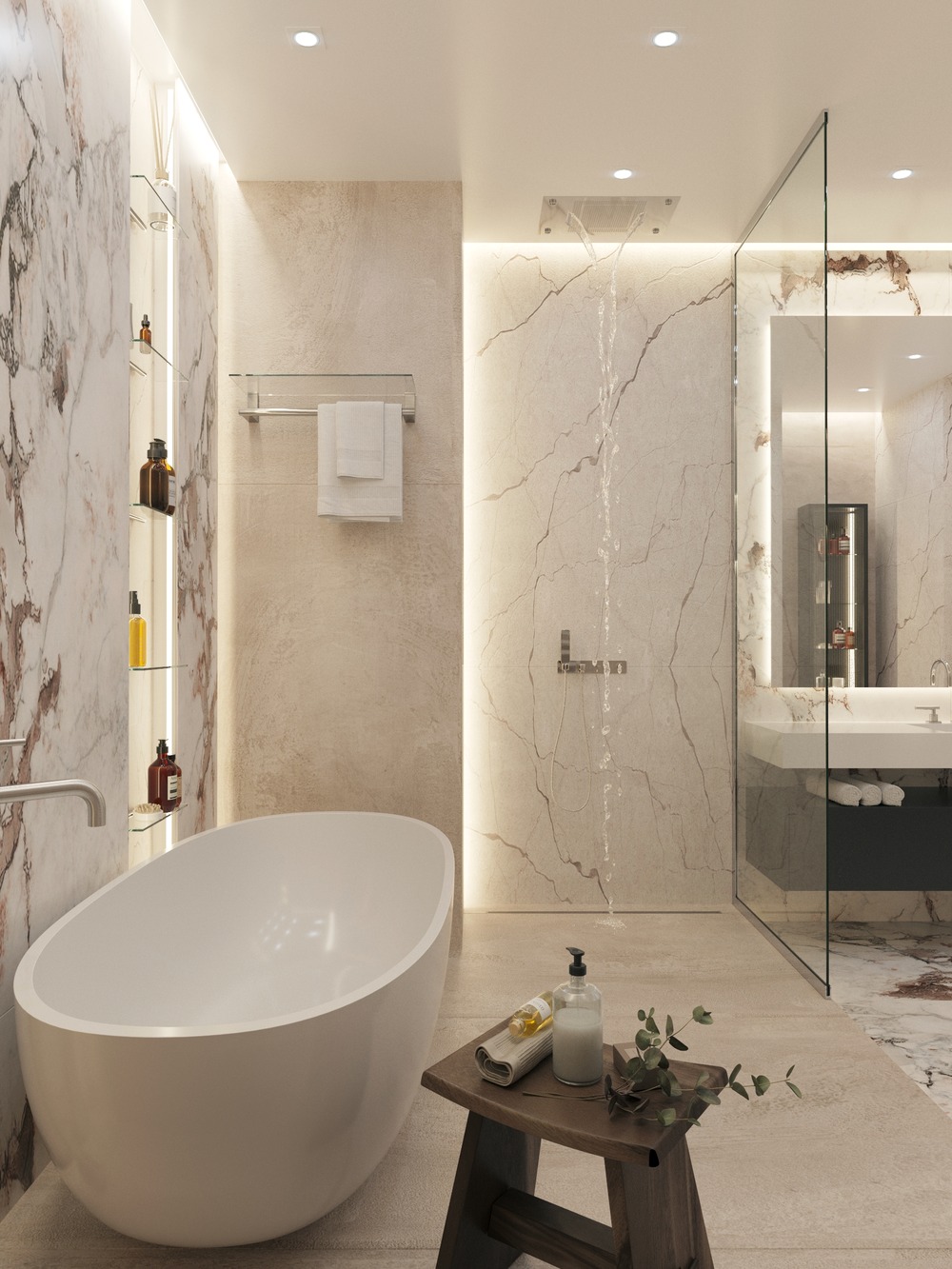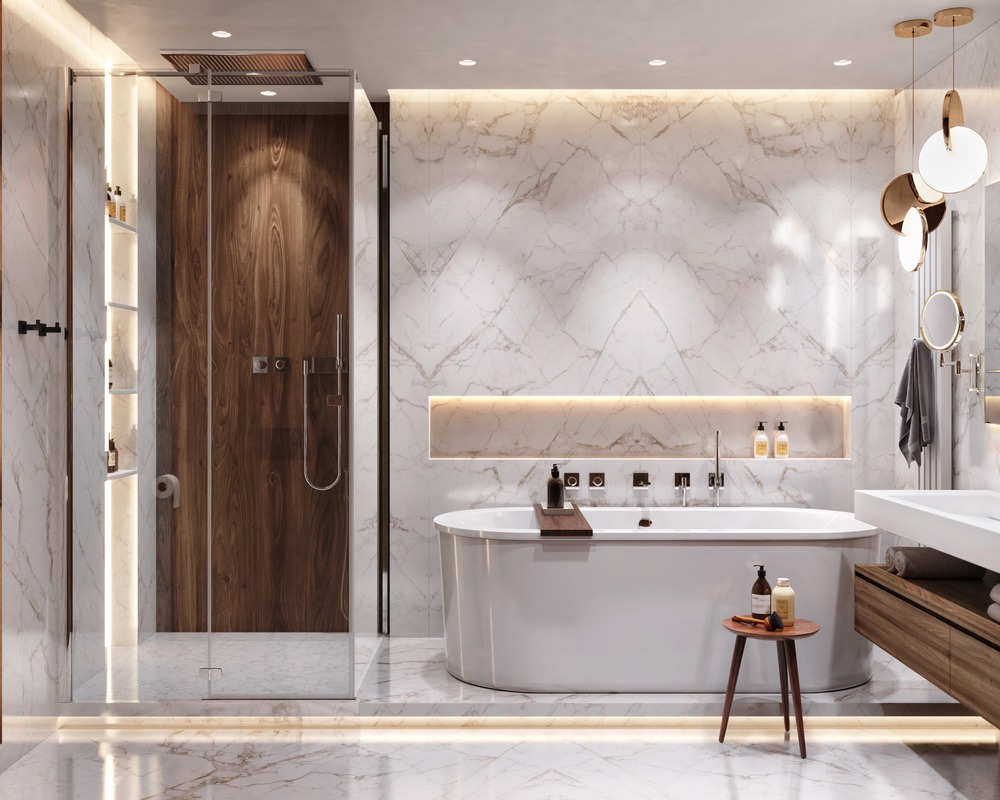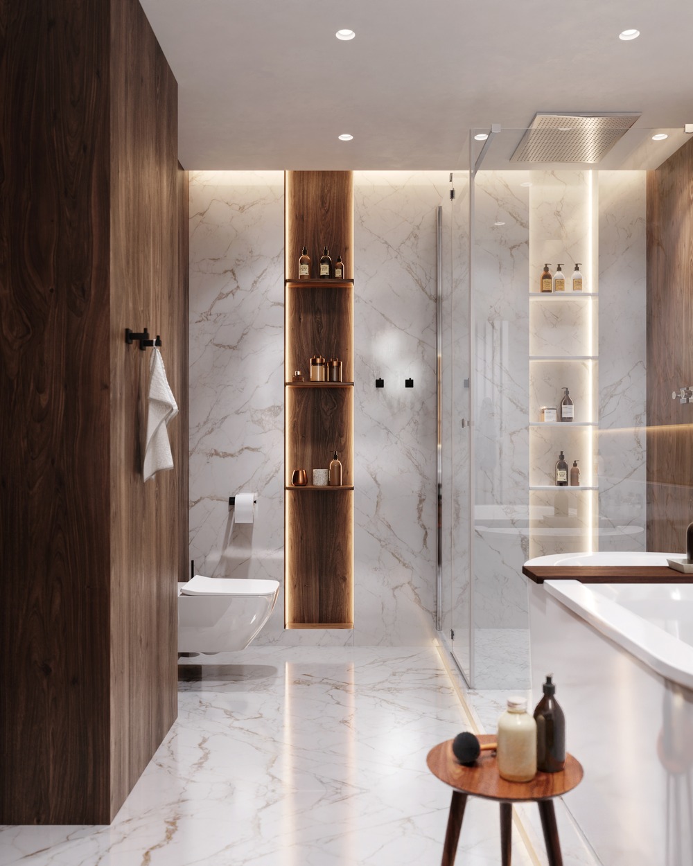 В отделке ванной комнаты используется крупноформатный керамогранит под мрамор. Чтобы комната не выглядела чересчур холодной, были добавлены деревянные элементы, а также небольшие золотые акценты, которые идеально вписались в интерьер.