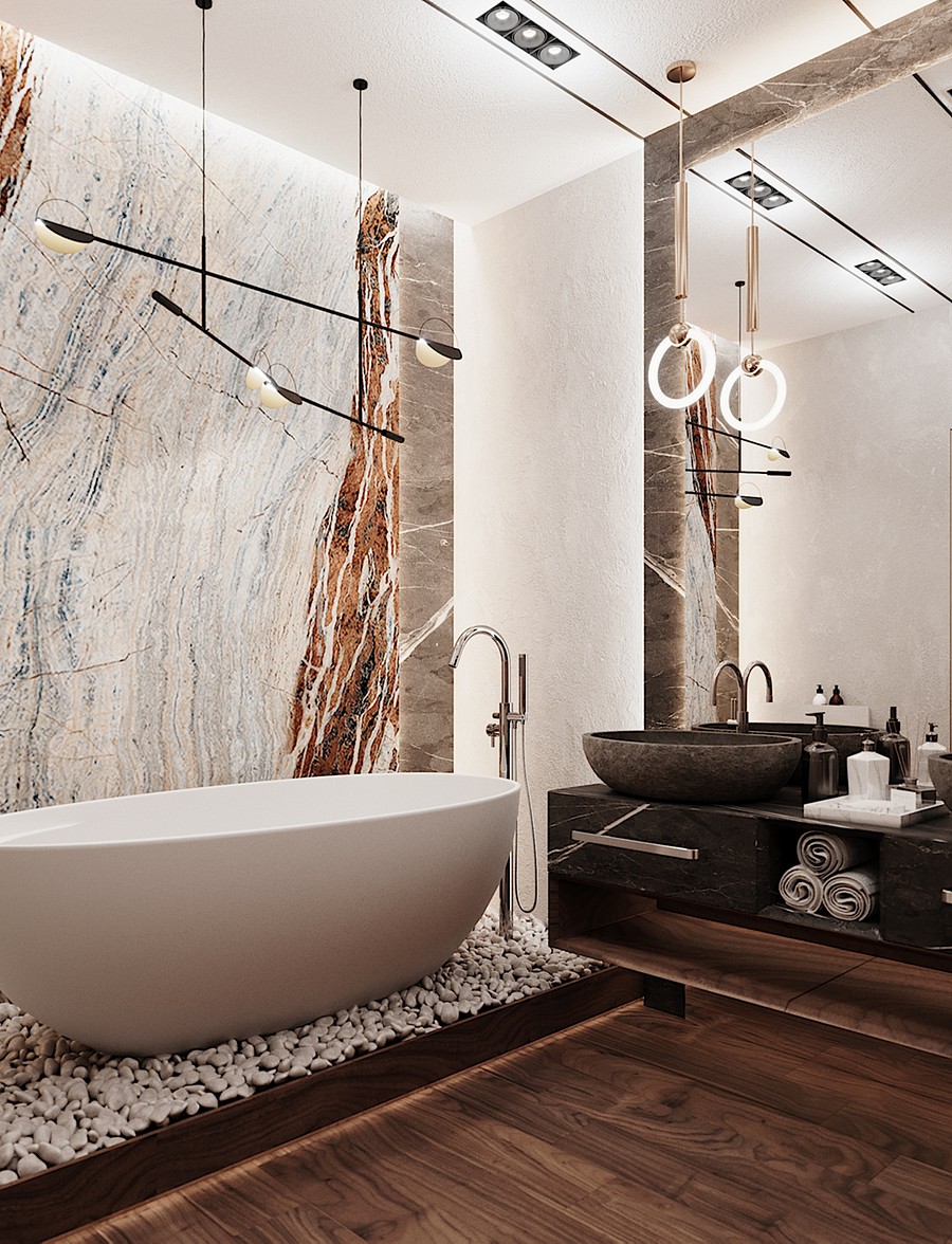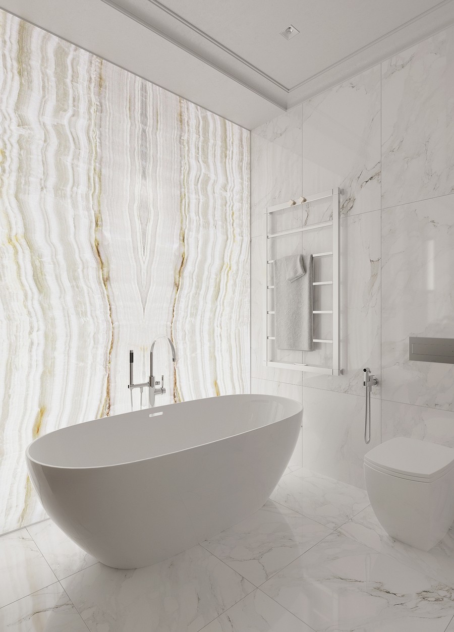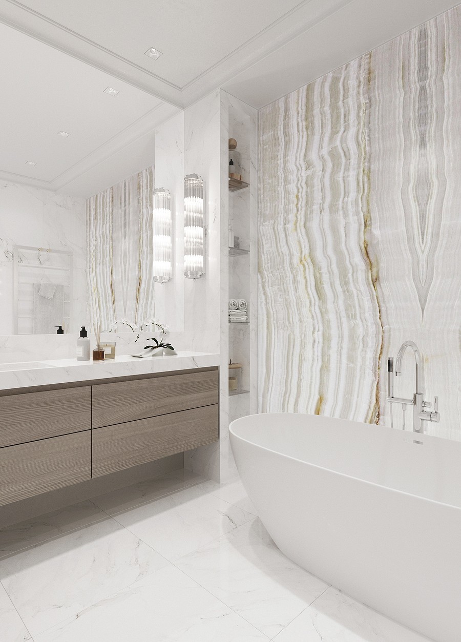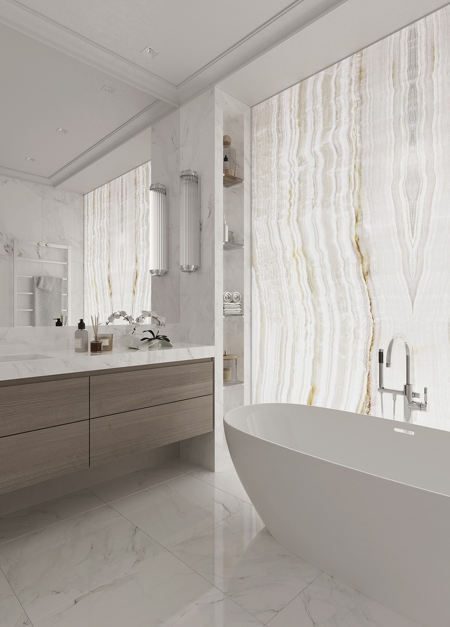 Дизайн этой ванной комнаты выделяется сразу двумя интересными решениями. Первое из них - это отдельно стоящая ванна, а второе - слеб оникса с подсветкой.