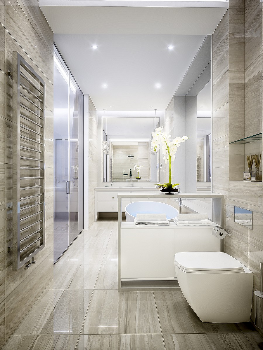 Современный минималистичный дизайн прослеживается во всей квартире, в том числе и в ванной комнате.
