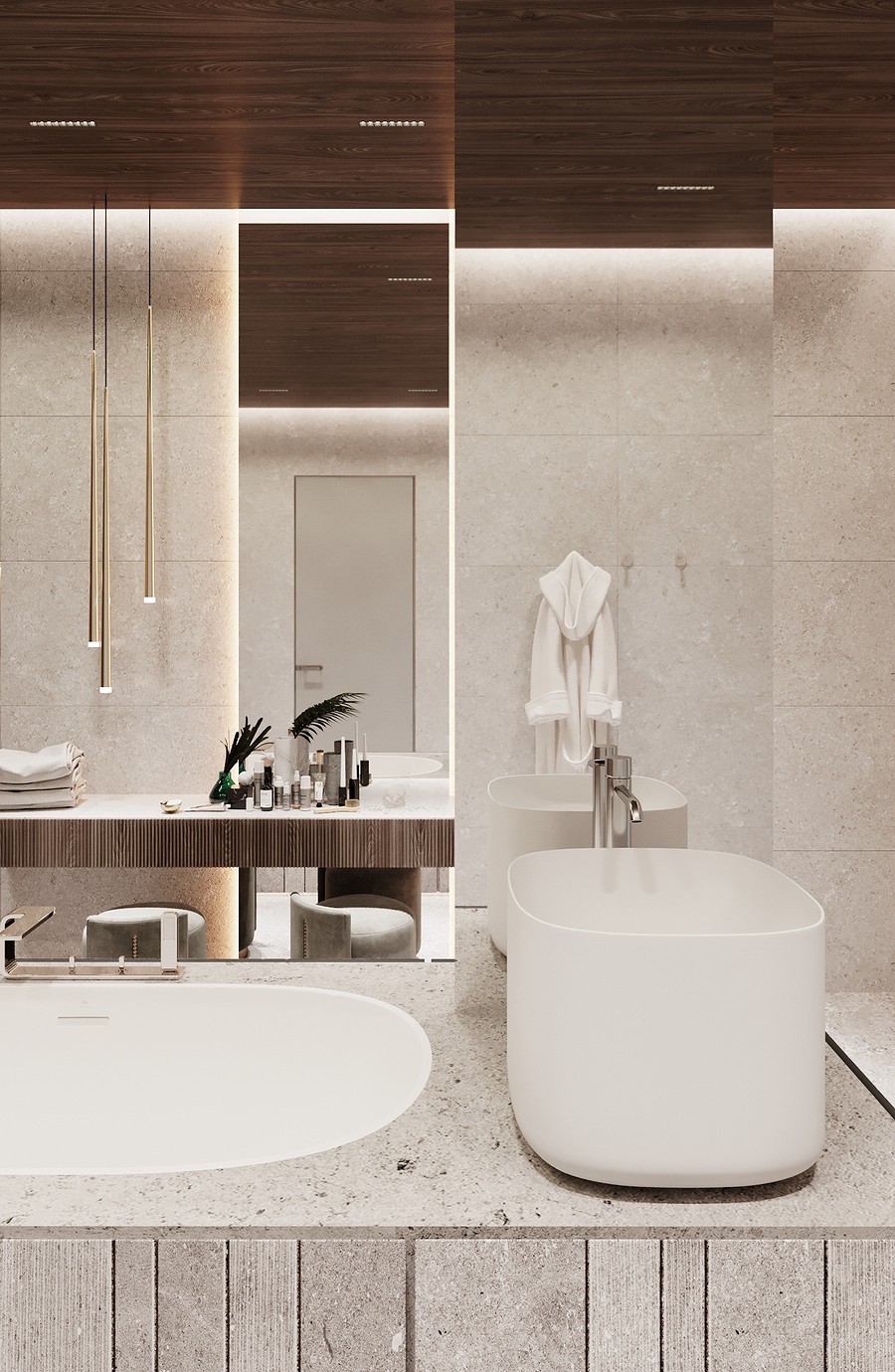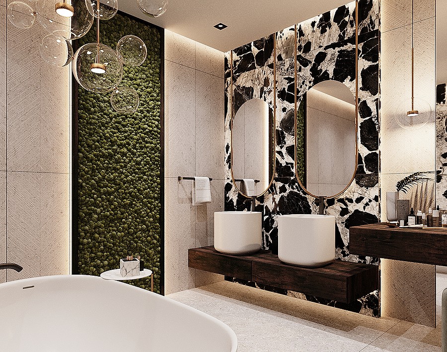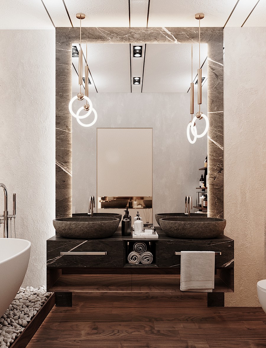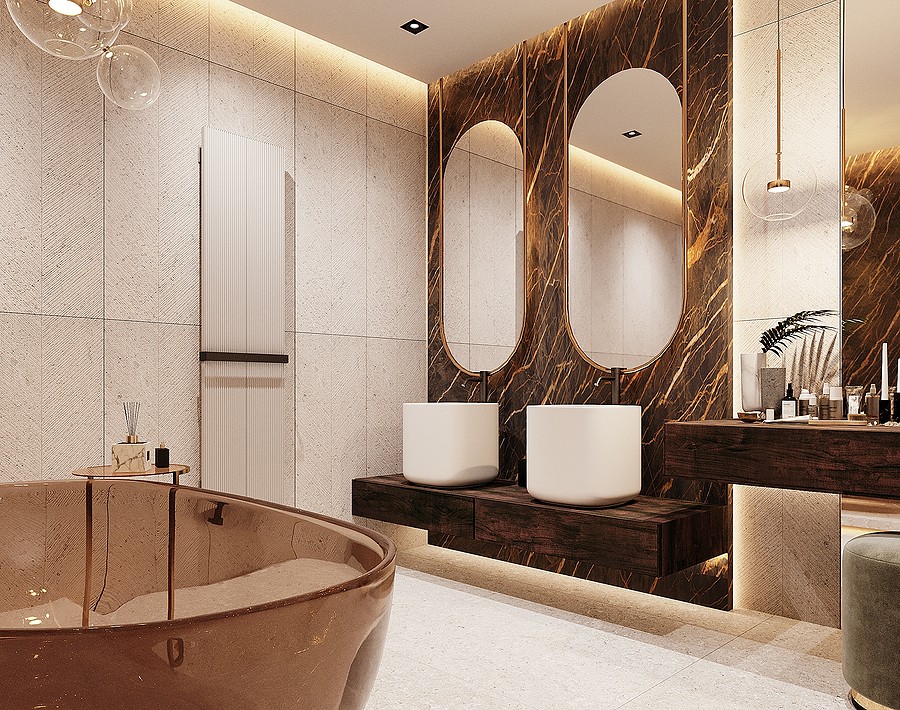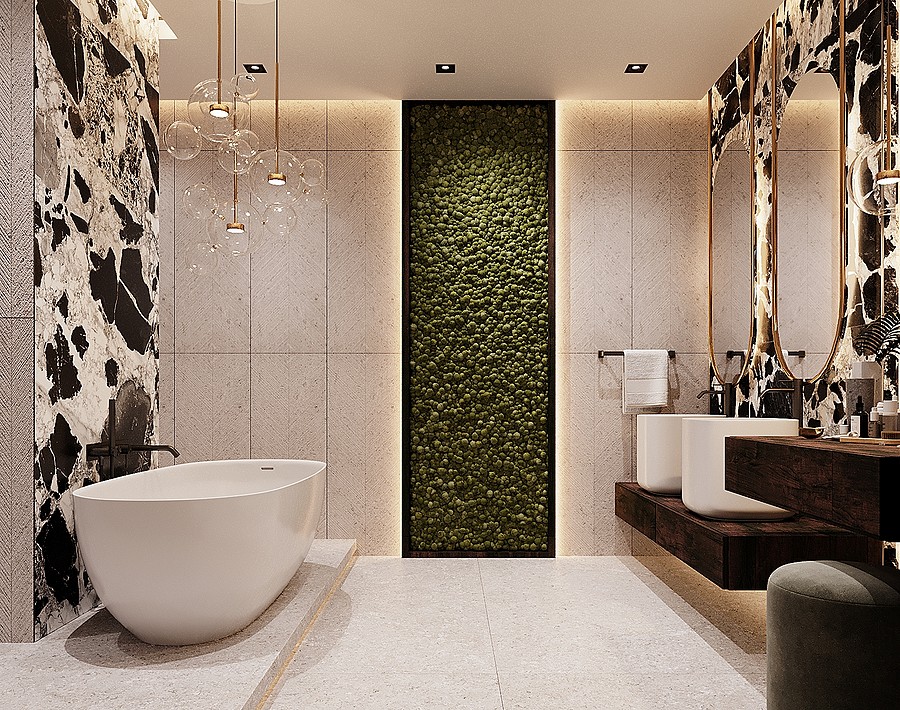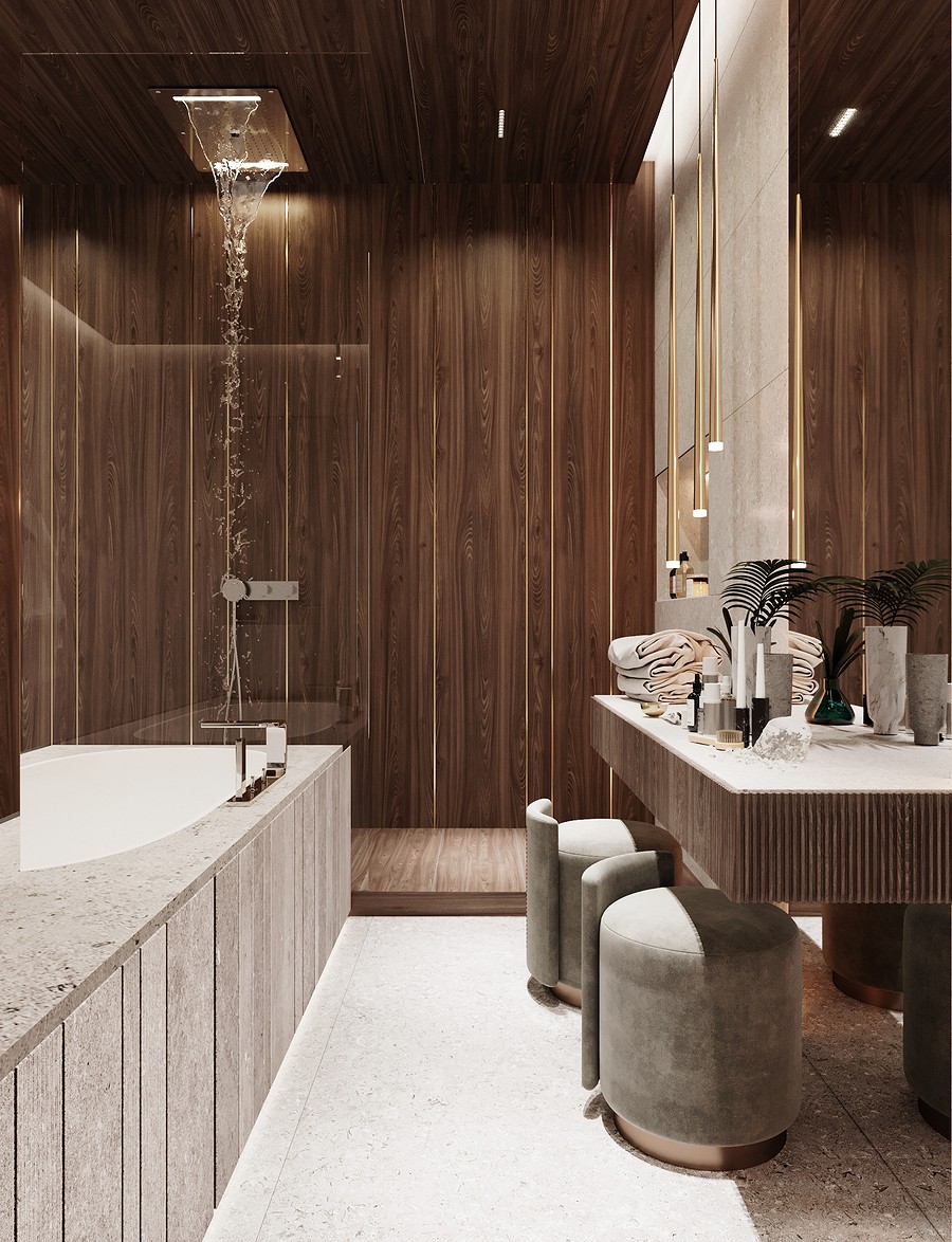 В отделке ванной комнаты используется крупноформатный керамогранит под мрамор. Чтобы комната не выглядела чересчур холодной, были добавлены деревянные элементы, а также небольшие золотые акценты, которые идеально вписались в интерьер.
