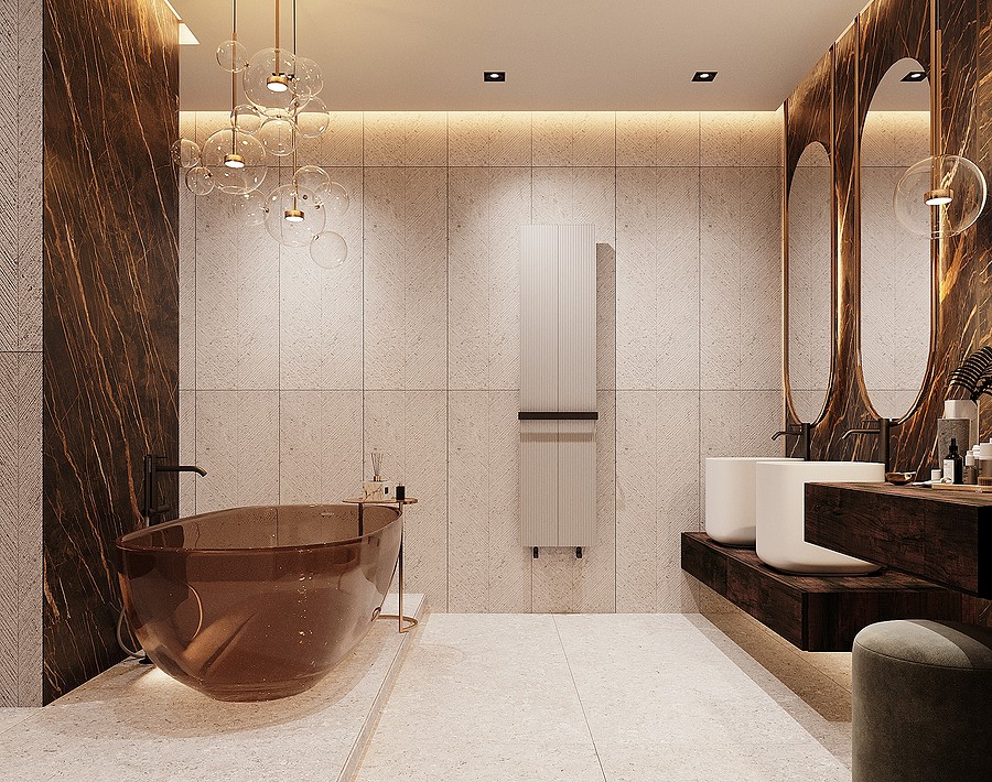 В окончательном варианте, который больше всего понравился заказчику, используется керамогранит темного оттенка и ванна из коричневого стекла.