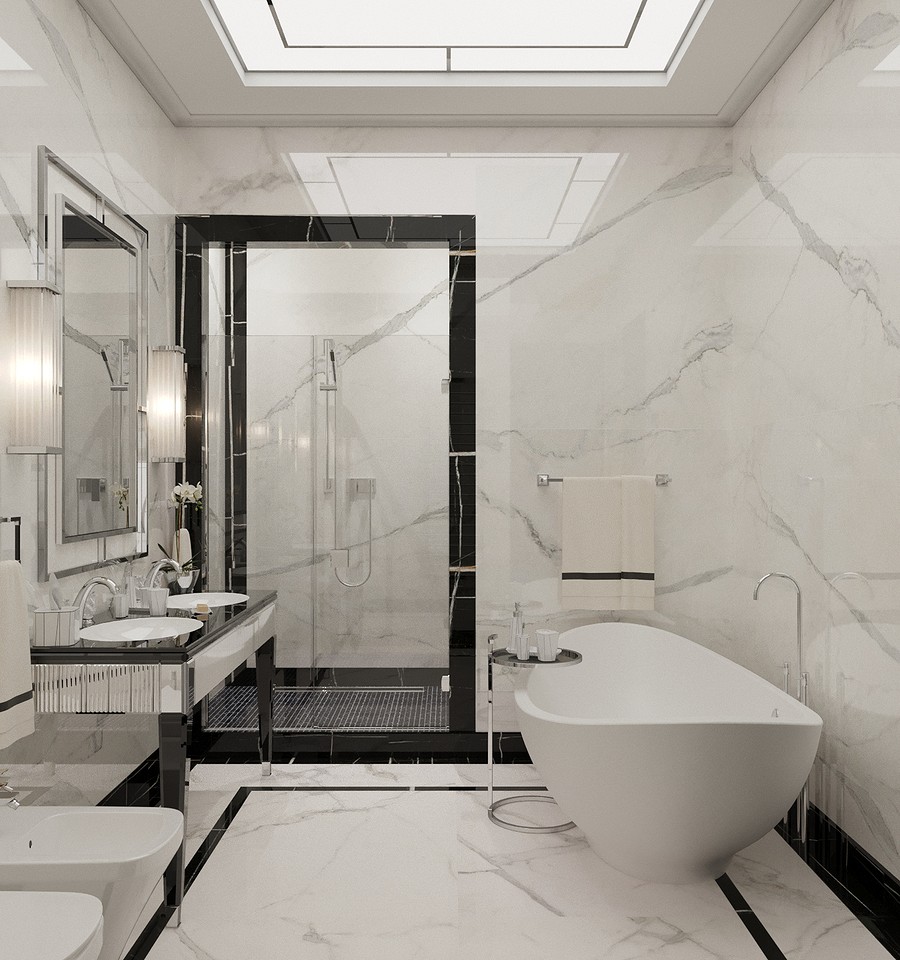 Ванная комната в стиле ар-деко, в котором скрупулезно подобраны материалы тщательно проработан каждый элемент.