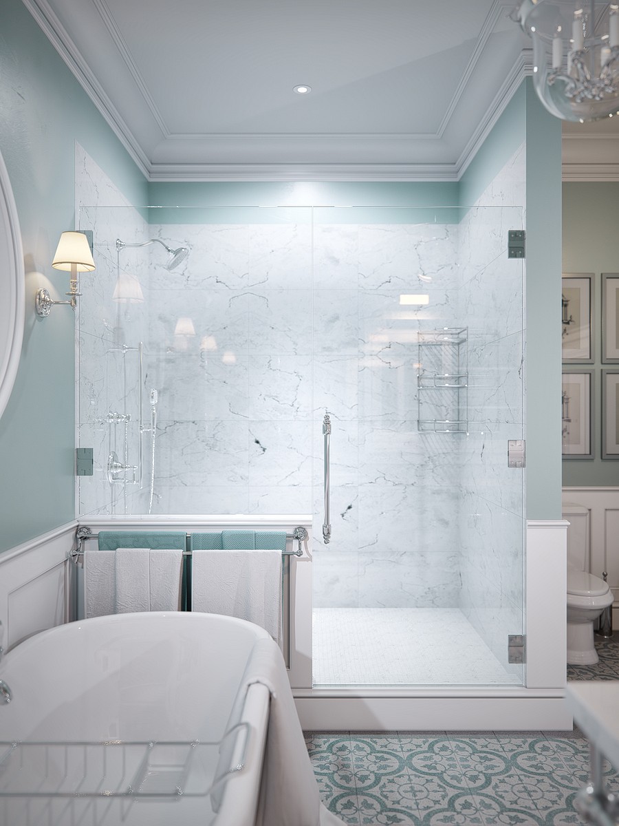 Отдельно стоящую ванну можно разместить не только в современных, но и в классический интерьерах. Пример ниже - ванная комната в стиле американской классики.