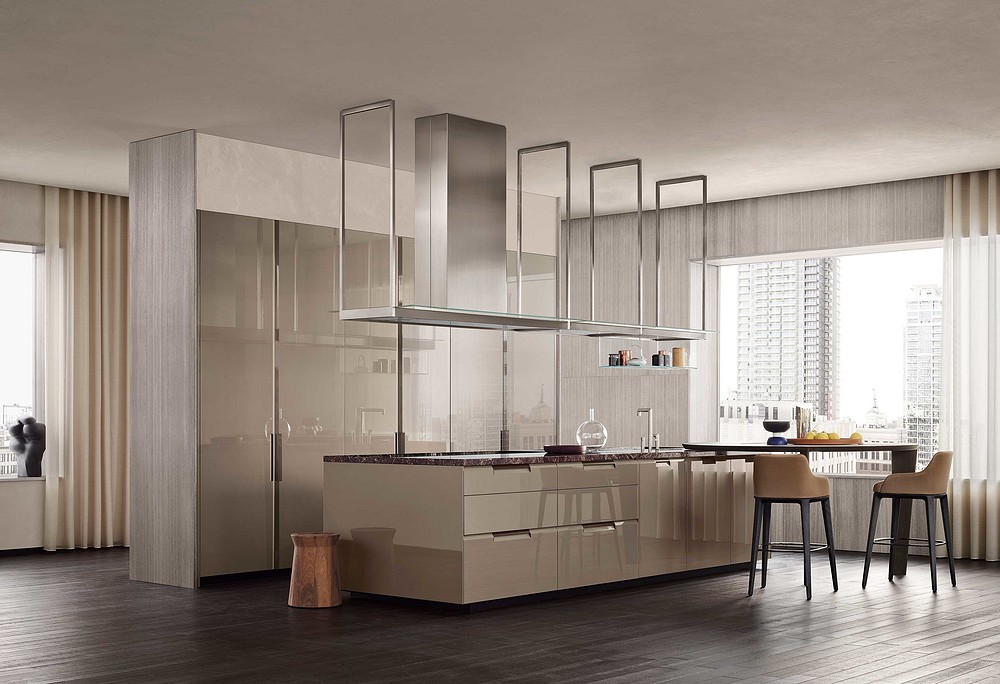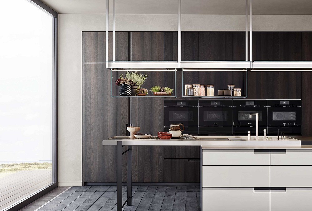 Производитель не забыл об удобстве и технической части. К примеру, кухня может быть оборудована инновационной «парящей» рабочей поверхностью на ножках Minus, новой системой вытяжек Infinity со встроенной системой освещения или дополненными стеклянными подвесными модулями-полками.