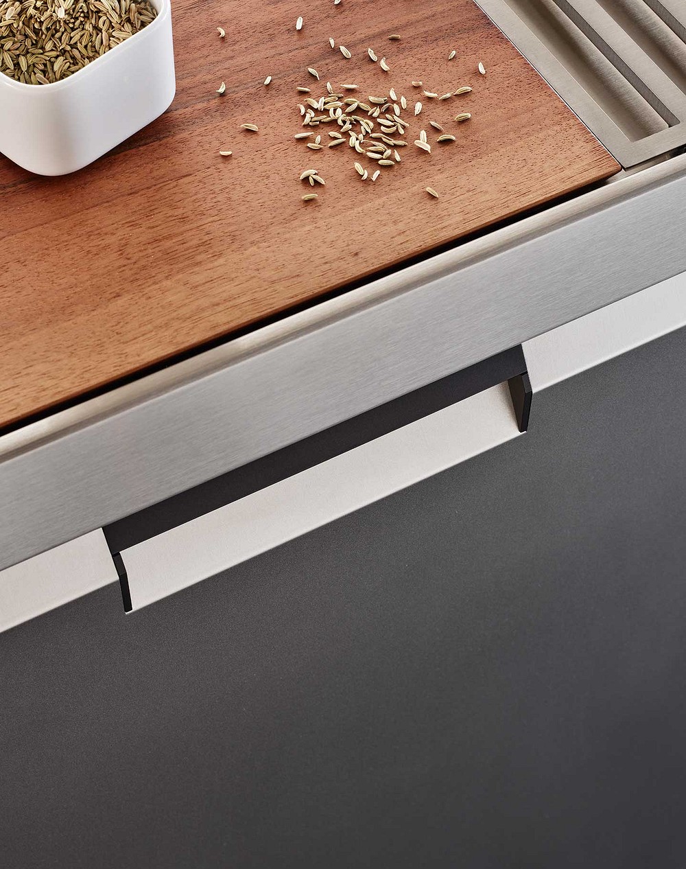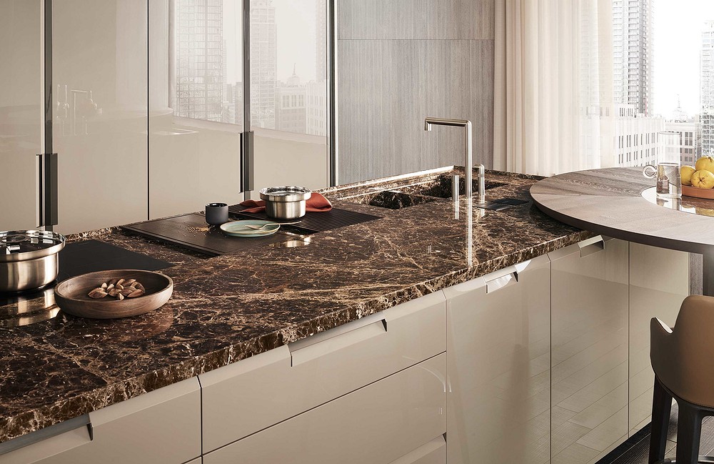 Особенностью этой кухни премиум-класса стали ее фасады, которые имеют толщину 26 мм и отличаются полным отсутствием выступающих элементов. Эргономичный дизайн позволяет открывать дверцы шкафов с помощью лаконичных интегрированных ручек, расположенных в боковой или верхней части.