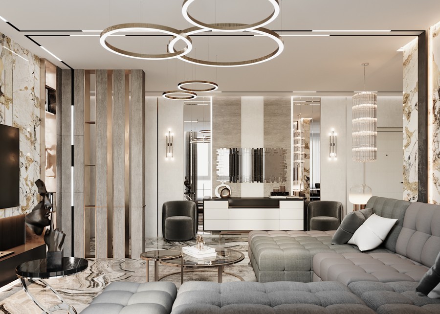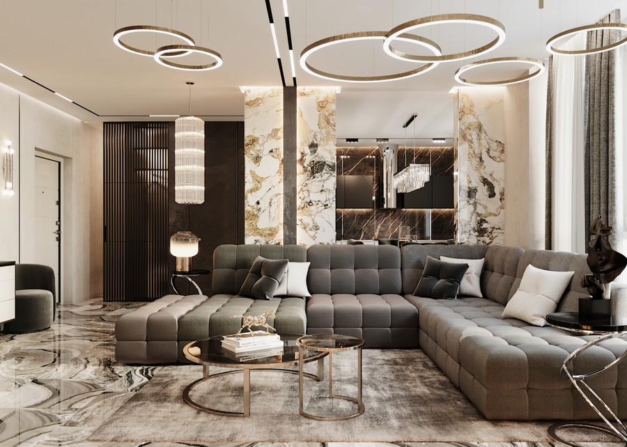Проект 100-метровой квартиры в стиле ар-деко, с обилием мрамора и стеклянных элементов в гостиной.
