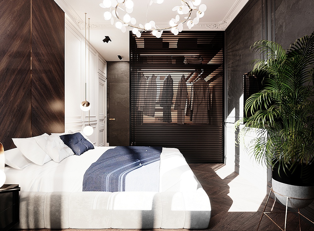 Особенности: большие окна, использование различных по фактуре материалов, спальня с открытыми гардеробом, перепланировка