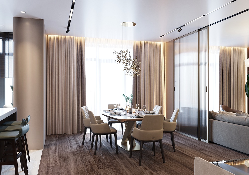 Одной из особенностей этого проекта стала большая гостиная, совмещенная с кухней и обеденной зоной – это дает возможность наслаждаться чувством простора, и даже при большом количестве деталей, интерьер остается очень лаконичным.