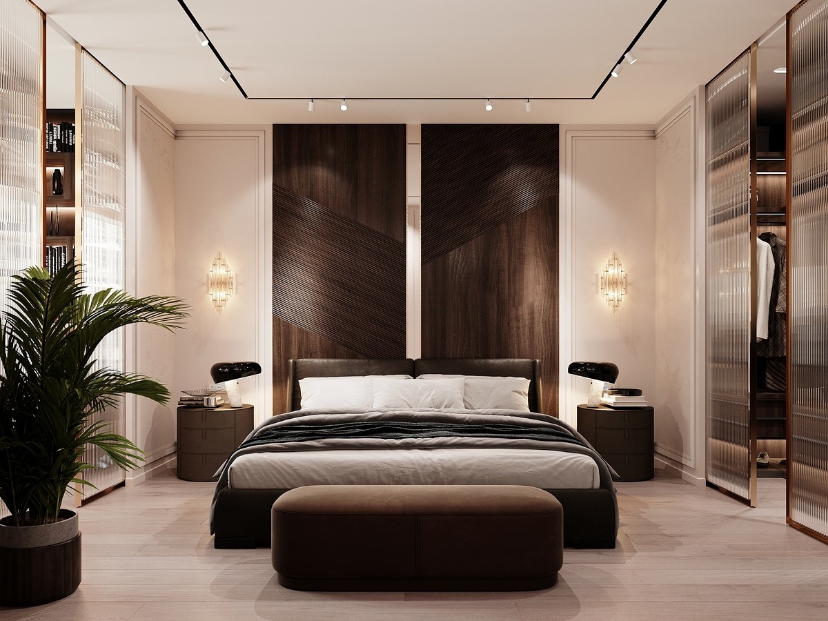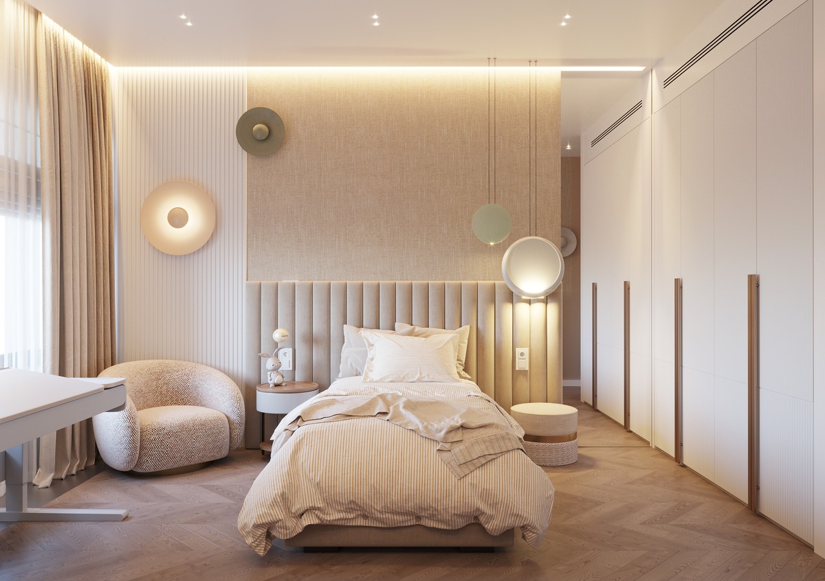 спальню, ванную и гардеробную. Детский блок включает комнату ребенка, игровую и ванную. Стилистика квартиры едина и