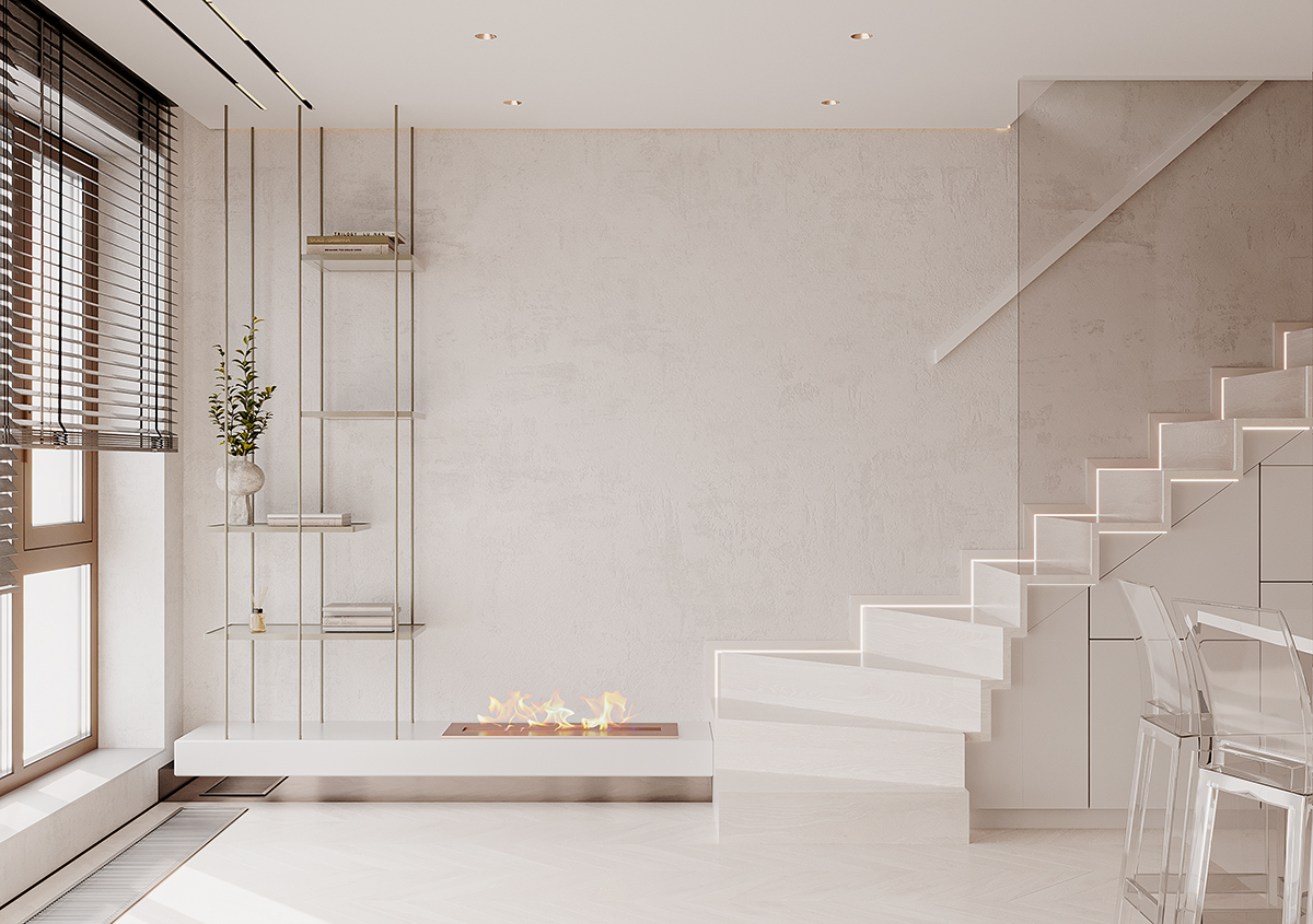 Особенности: гостиная, объединенная с прихожей, панорамные окна, биокамин, мрамор в отделке,