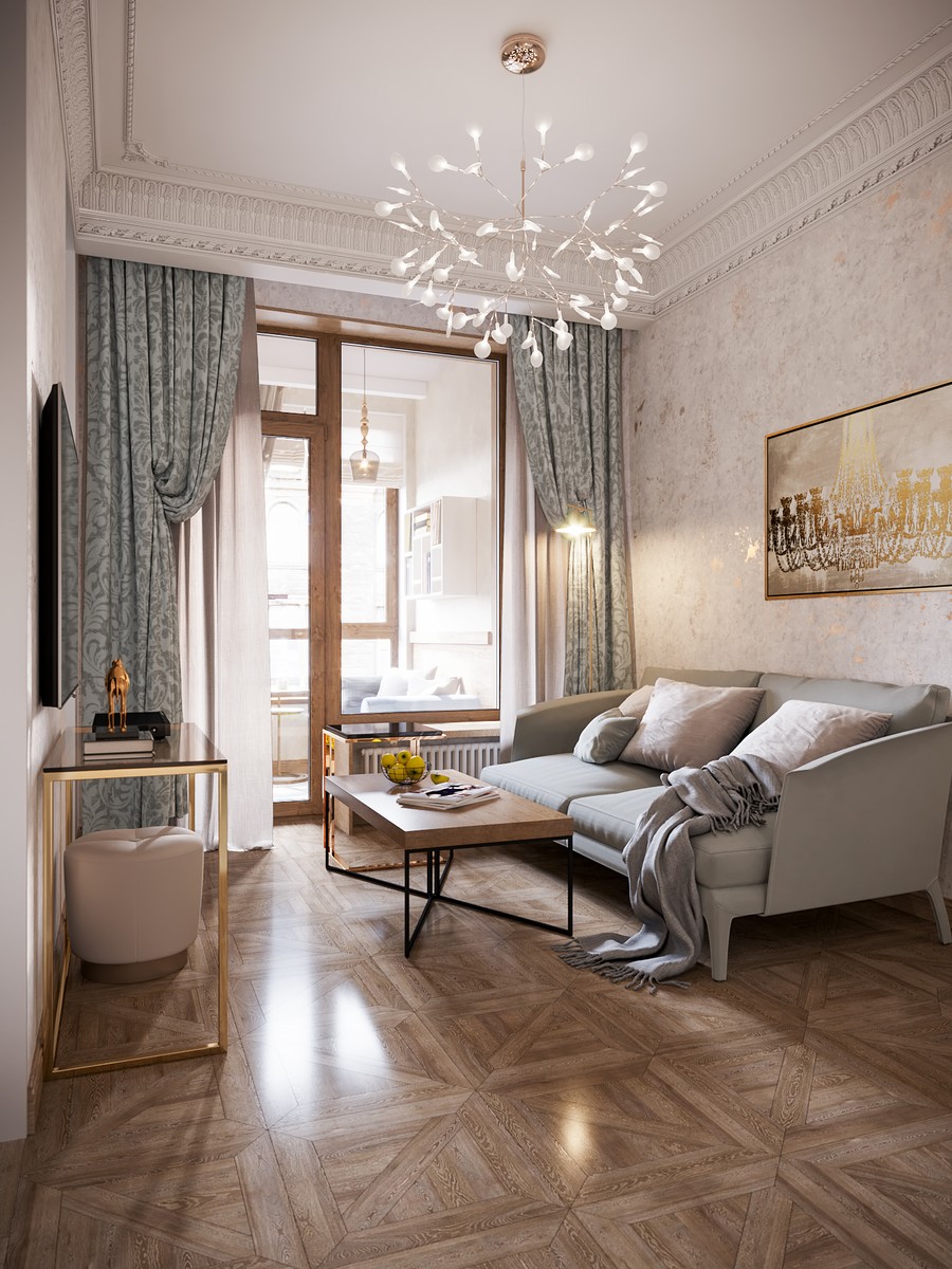 Интерьер этой небольшой квартиры вобрал в себя лучшее от классики, ар-деко, и современного стиля. В интерьере не только грамотно и гармонично подобраны материалы, цвета и мебель, но и сделана очень удобная и функциональная перепланировка с учетом всех потребностей хозяина!