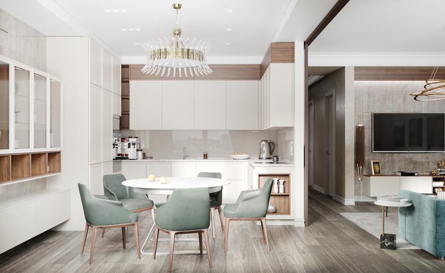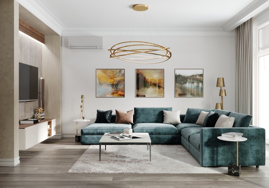Современный интерьер с элементами классики. В основе лежат светлые оттенки, а в качестве контрастного элемента выступает диван глубокого изумрудного цвета.