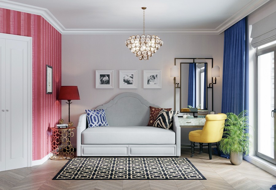 Палитра спальни построена на контрасте ярких цветов: глубокий розовый, насыщенный желтый и синий. Чтобы успокоить эту яркую гамму, мы добавили светлые цвета и современную классическую мебели. Как Вам такой микс?