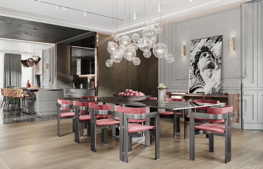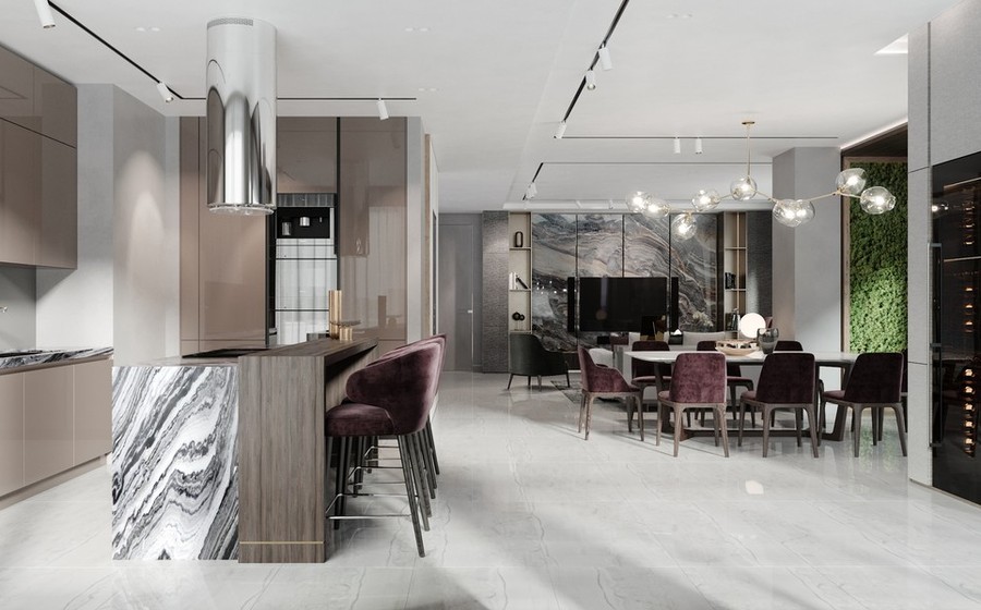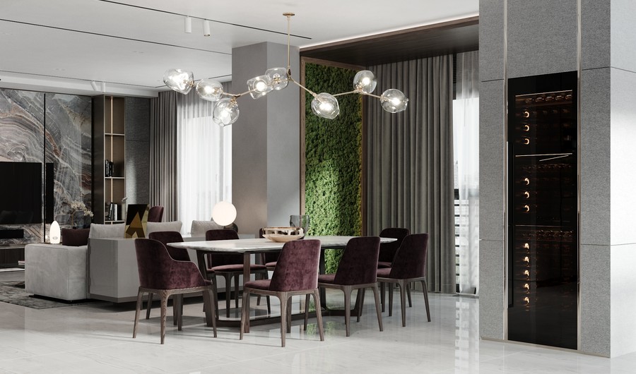 В основе интерьера в проекте "LUXURY & STATUS" лежат разные оттенки серого и бежевого. Чтобы избавиться от однотонности и оживить интерьер, мы добавили позолоченные предметы декора и оформили одну из стен натуральным мхом. Финальным штрихом стали кресла и стулья винного оттенка, которые вносят в интерьер статуса и благородства.