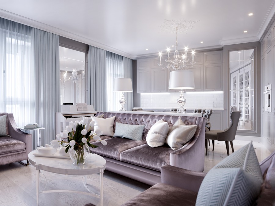 Интерьер квартиры в ЖК "Riverside" можно охарактеризовать как тонкий, нежный и чувствительный, а необычное сочетание лилового, голубого, серого и бежевого создает атмосферу безмятежности и складывается ощущение, что время остановилось.