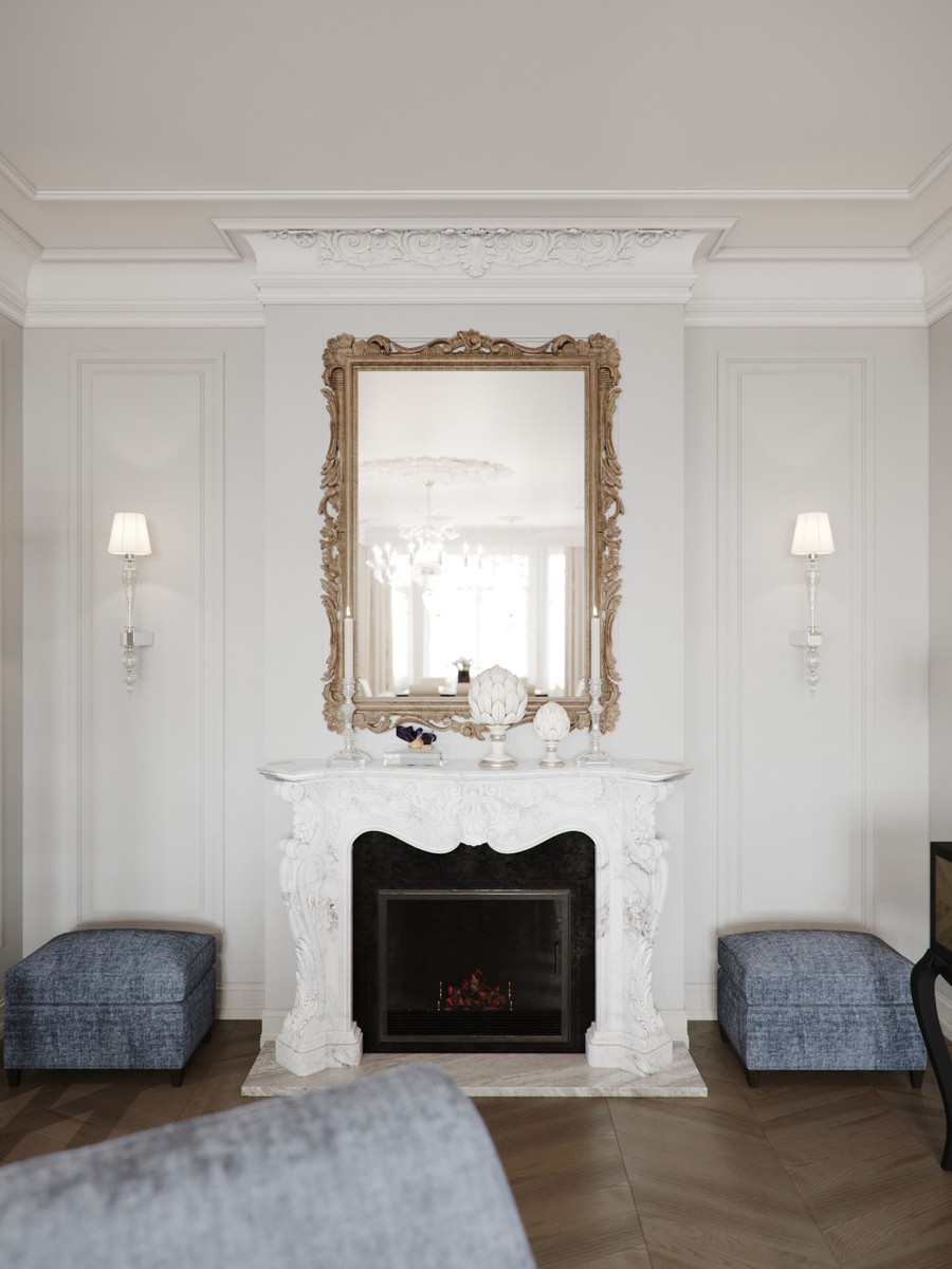 Каминную зону можно украсить также большим зеркалом, например, в позолоченной раме.
