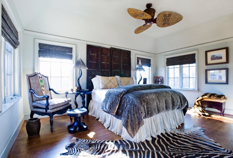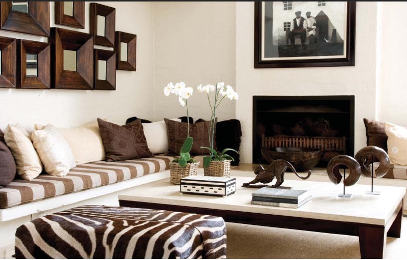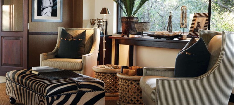 Шкуры животных, натуральные или их имитация из искусственных материалов — основная примета стиля. Простые узоры в виде черно-белых или ярких желтых, оранжевых, красных кругов и зигзагов. Аксессуары африканского интерьера: ритуальные маски, статуэтки слоновой кости или черного дерева, тамтамы, наконечники копий, грубоватая глиняная или деревянная посуда.