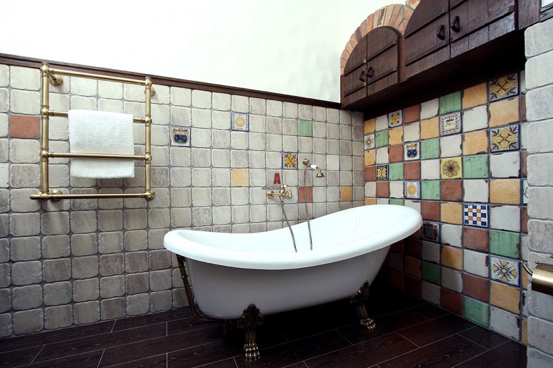 Пол предпочтительно из деревянных половиц, чтобы по нему приятно пройти босыми ногами. Возможны, конечно, и иные покрытия. Подойдут, например, природная фактура керамической плитки или керамогранита, ламинат или линолеум, имитирующий деревянную текстуру. Циновки, грубоватые ковры ручной работы, плетеные коврики на таком полу смотрятся очень органично. Потолок чаще всего простой, оштукатуренный. В качестве декоративного элемента используют деревянные балки.