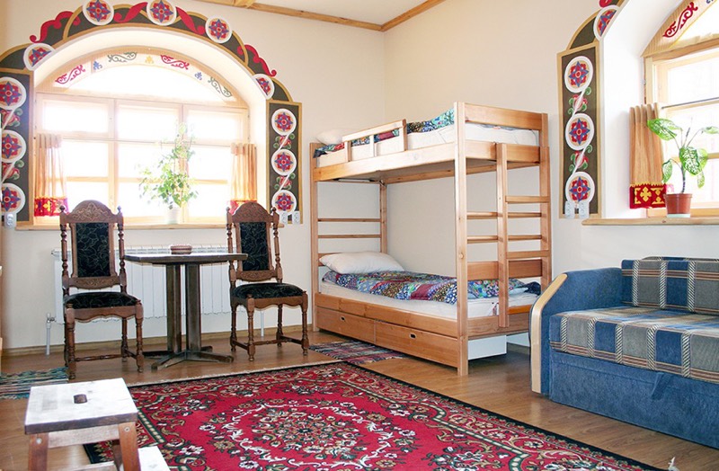 Двери массивные, простой формы, окна обязательно деревянные. Важный элемент интерьера русского стиля — это шторы и занавески. Они могут быть из натурального некрашеного льна, светлого ситца, украшены вышивкой или кружевом и обязательно должны гармонировать со стенами.