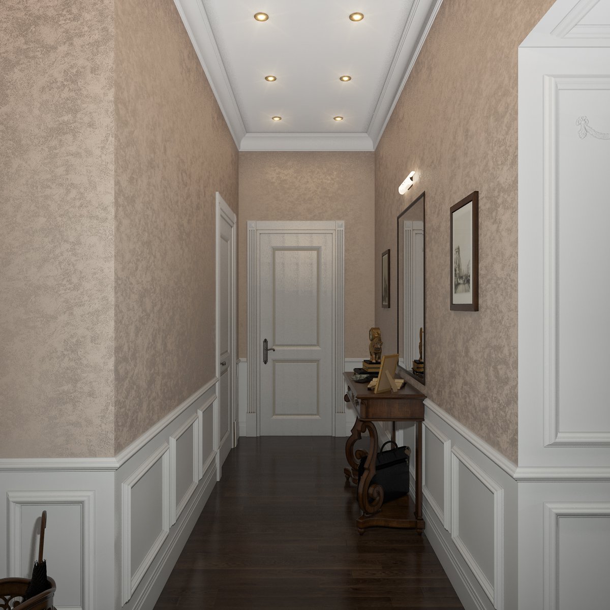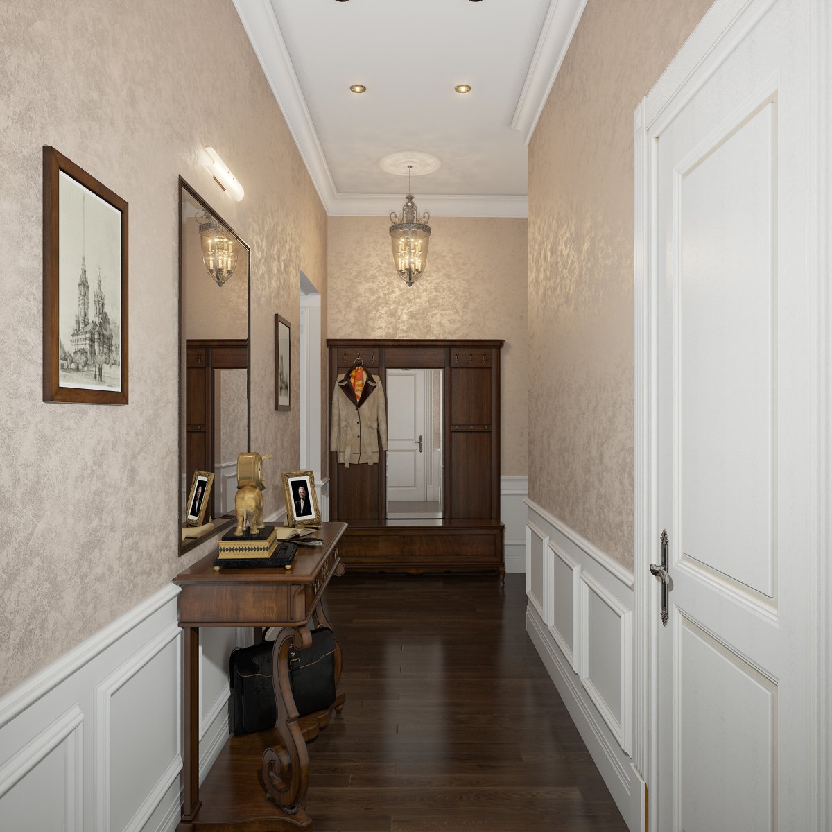 Узкий коридор кажется шире за счет теплого золотистого цвета обоев. Деревянные детали подчеркивают ретро эффект. Фотографии и картины на стенах превращают скучное пространство в галерею, предваряющую раскрытие основного пространства и подготавливающий к тому, что интерьере будет решен художественно и творчески.