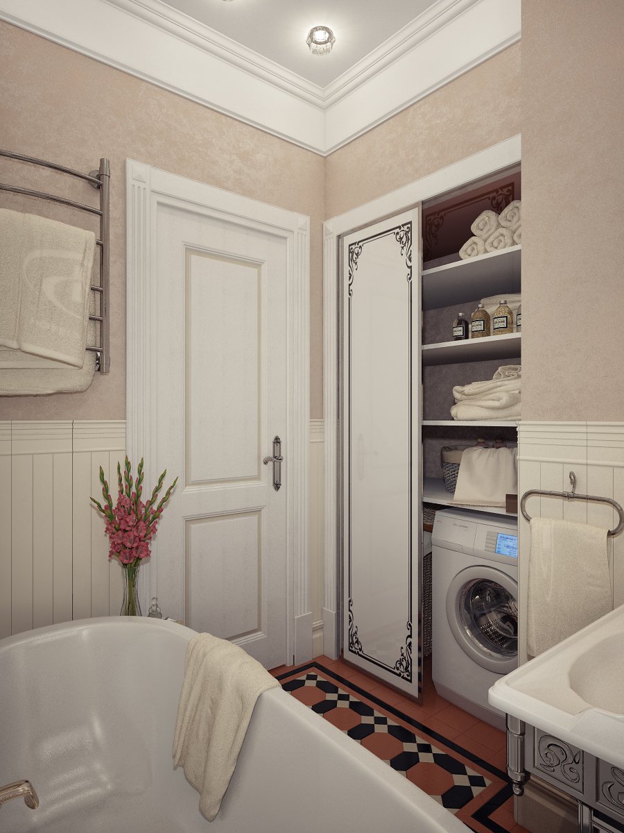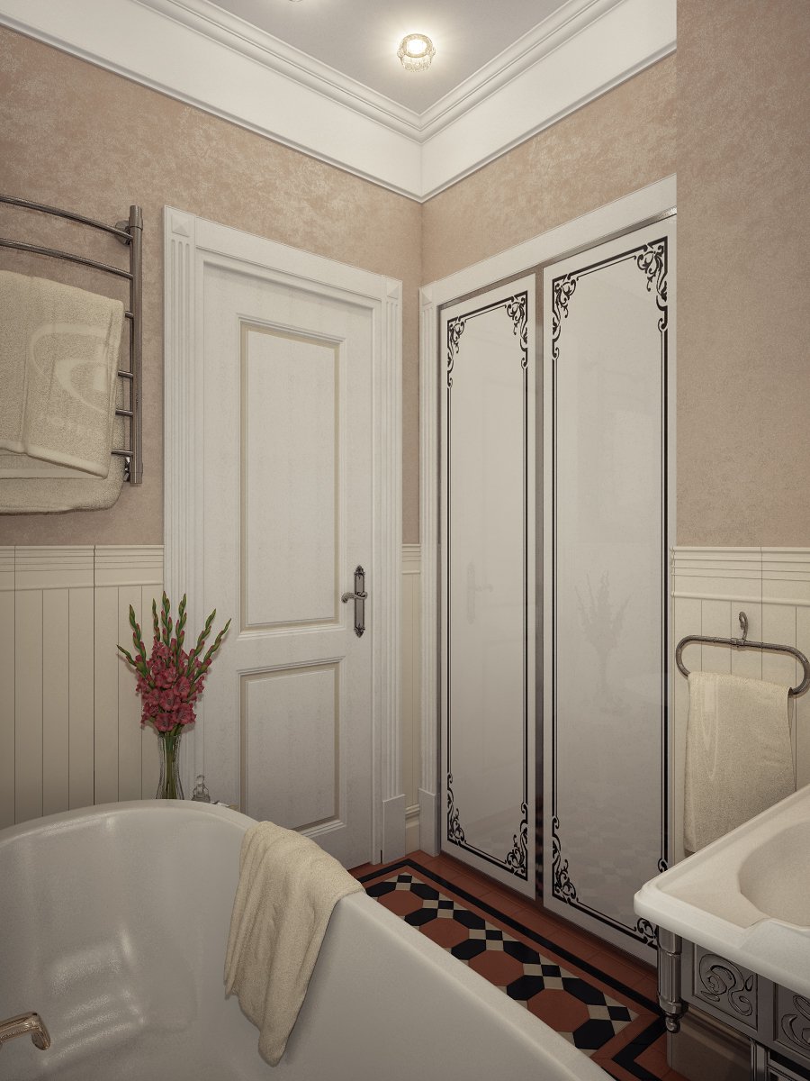 Санузел, включающий в себя и ванну, оборудован стилизованной под старину сантехникой.